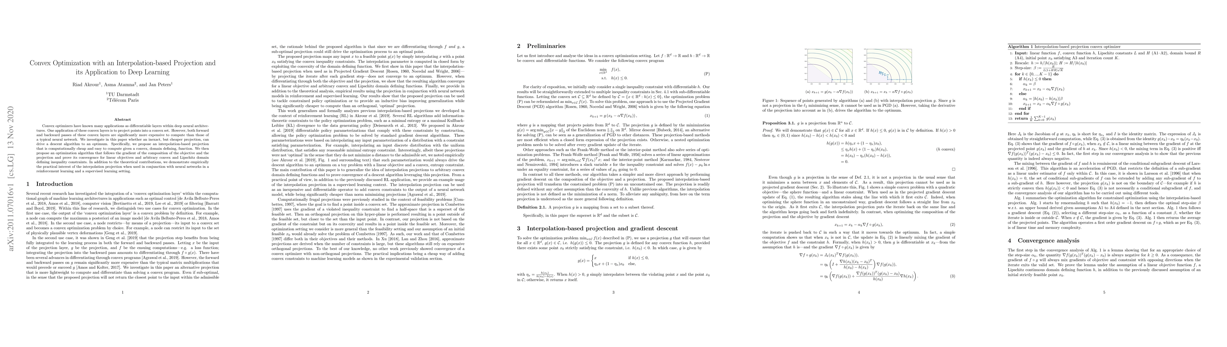 Convex optimizers have known many applications as differentiable layers within deep neural architectures. One application of these convex layers is to project points into a convex set. However, both forward and backward passes of these convex layers are significantly more expensive to compute than those of a typical neural network. We investigate in this paper whether an inexact, but cheaper projection, can drive a descent algorithm to an optimum. Specifically, we propose an interpolation-based projection that is computationally cheap and easy to compute given a convex, domain defining, function. We then propose an optimization algorithm that follows the gradient of the composition of the objective and the projection and prove its convergence for linear objectives and arbitrary convex and Lipschitz domain defining inequality constraints. In addition to the theoretical contributions, we demonstrate empirically the practical interest of the interpolation projection when used in conjunction with neural networks in a reinforcement learning and a supervised learning setting.