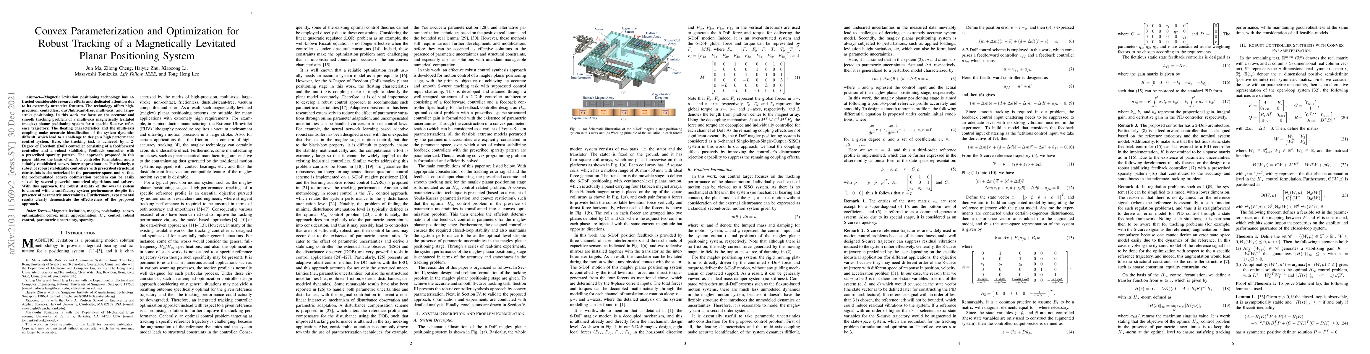 This paper proposes a convex parameterization and optimization method for designing a robust control system to achieve accurate tracking of a multi-axis magnetically levitated planar positioning system along a specific S-curve trajectory. The approach ensures robust stability and satisfactory performance despite parametric uncertainties through a 2-DoF controller and convex optimization.
