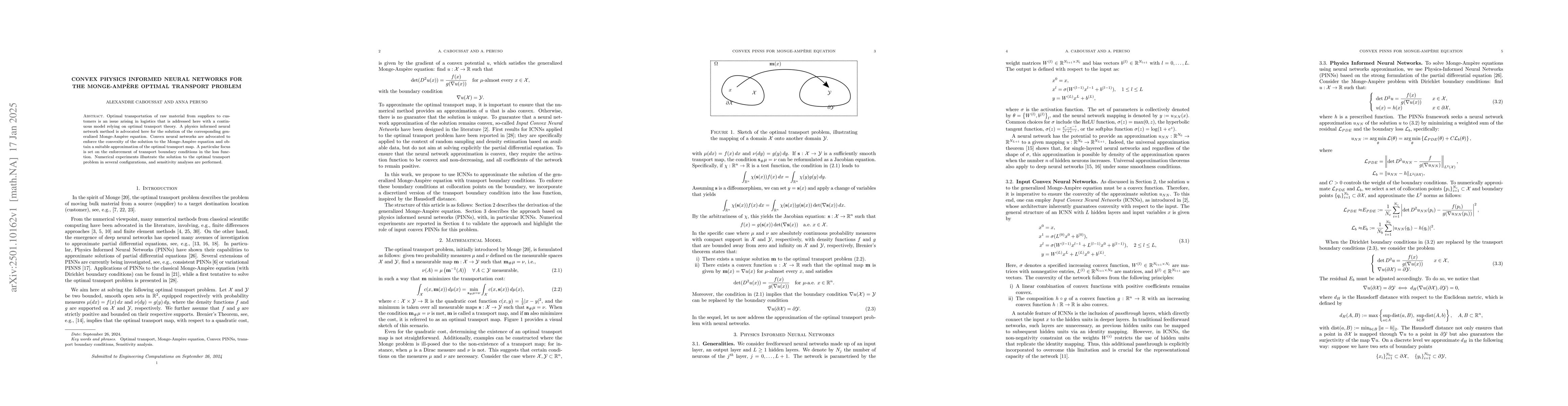 This paper proposes a convex physics informed neural network approach to solve the Monge-Ampère optimal transport problem, using convex neural networks to enforce solution convexity and a specialized loss function to handle transport boundary conditions. Numerical experiments demonstrate the method's effectiveness across various configurations.