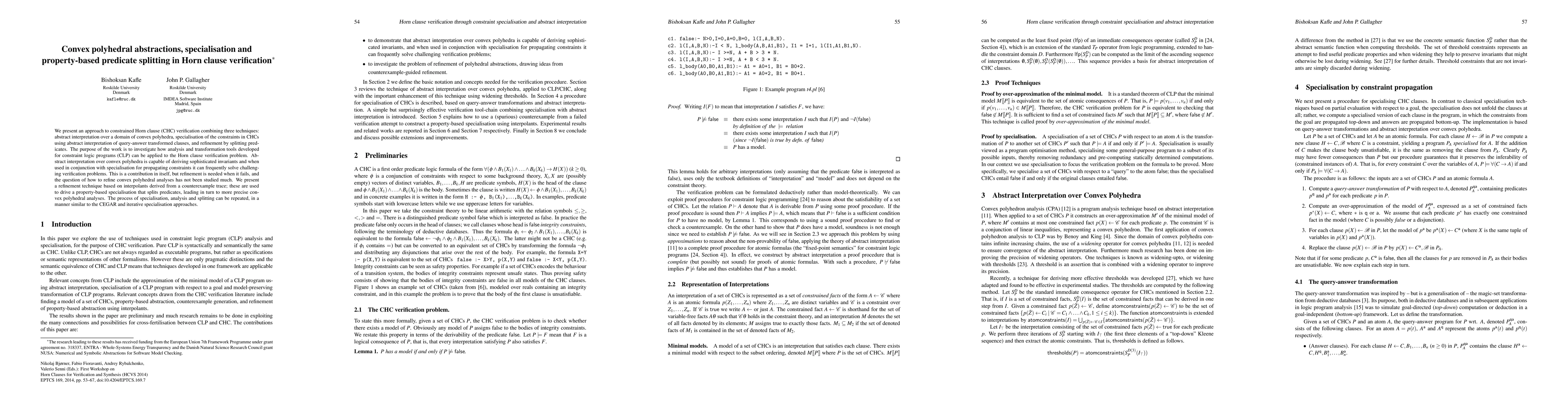 This paper proposes an innovative approach for verifying constrained Horn clauses by integrating convex polyhedral abstractions, constraint specialisation, and predicate splitting. The method aims to leverage tools from constraint logic programs to enhance verification, employing abstract interpretation to derive invariants and refine analyses through iterative specialisation and predicate splitting driven by counterexamples.
