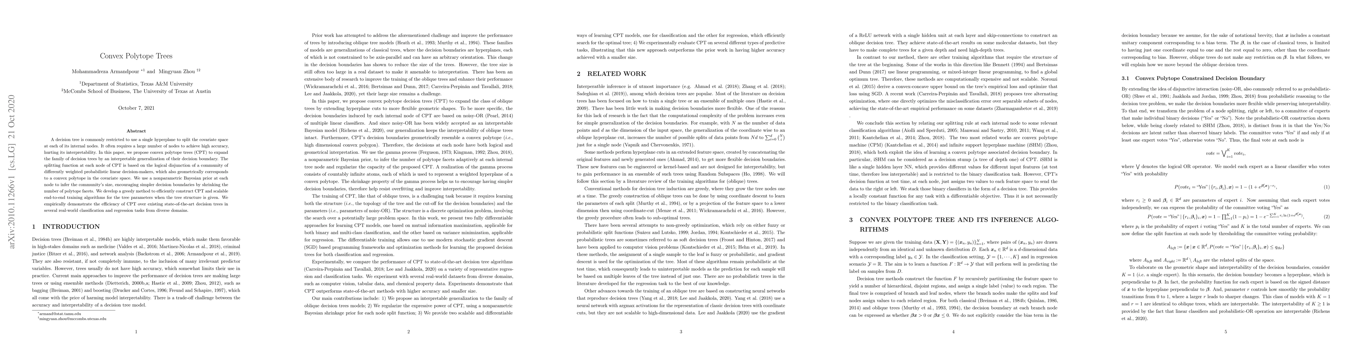 This paper introduces convex polytope trees (CPT), an interpretable generalization of decision trees where each node splits the covariate space using a convex polytope instead of a single hyperplane. The method employs a community of probabilistic linear decision-makers, and uses a nonparametric Bayesian prior to encourage simpler decision boundaries, resulting in fewer polytope facets.