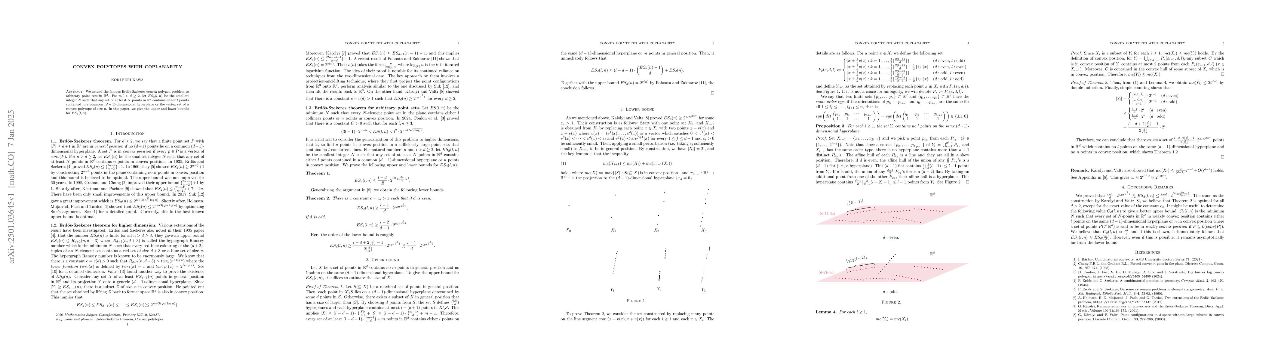 This paper determines the minimum number $N$ such that any set of at least $N$ points in $\mathbb{R}^d$ must contain either $l$ coplanar points or $n$ points forming a convex shape. It provides both upper and lower bounds for this number $ES_d(l,n)$.