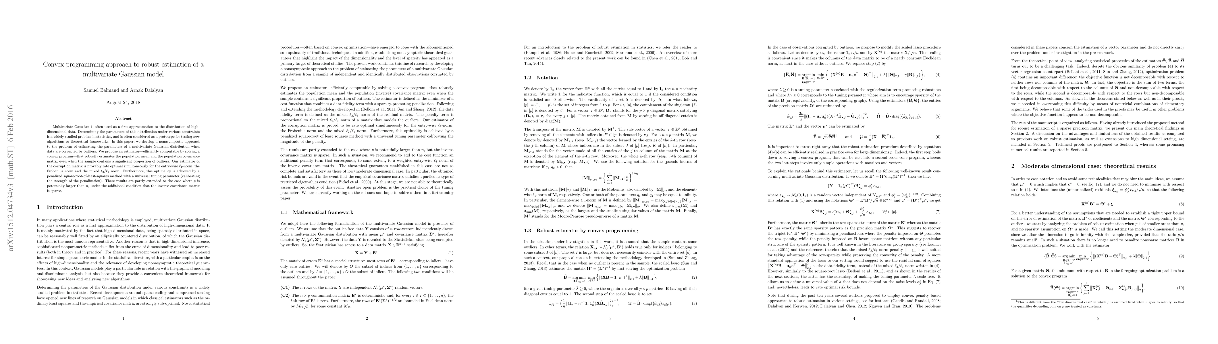Multivariate Gaussian is often used as a first approximation to the distribution of high-dimensional data. Determining the parameters of this distribution under various constraints is a widely studied problem in statistics, and is often considered as a prototype for testing new algorithms or theoretical frameworks. In this paper, we develop a nonasymptotic approach to the problem of estimating the parameters of a multivariate Gaussian distribution when data are corrupted by outliers. We propose an estimator---efficiently computable by solving a convex program---that robustly estimates the population mean and the population covariance matrix even when the sample contains a significant proportion of outliers. Our estimator of the corruption matrix is provably rate optimal simultaneously for the entry-wise $\ell_1$-norm, the Frobenius norm and the mixed $\ell_2/\ell_1$ norm. Furthermore, this optimality is achieved by a penalized square-root-of-least-squares method with a universal tuning parameter (calibrating the strength of the penalization). These results are partly extended to the case where $p$ is potentially larger than $n$, under the additional condition that the inverse covariance matrix is sparse.