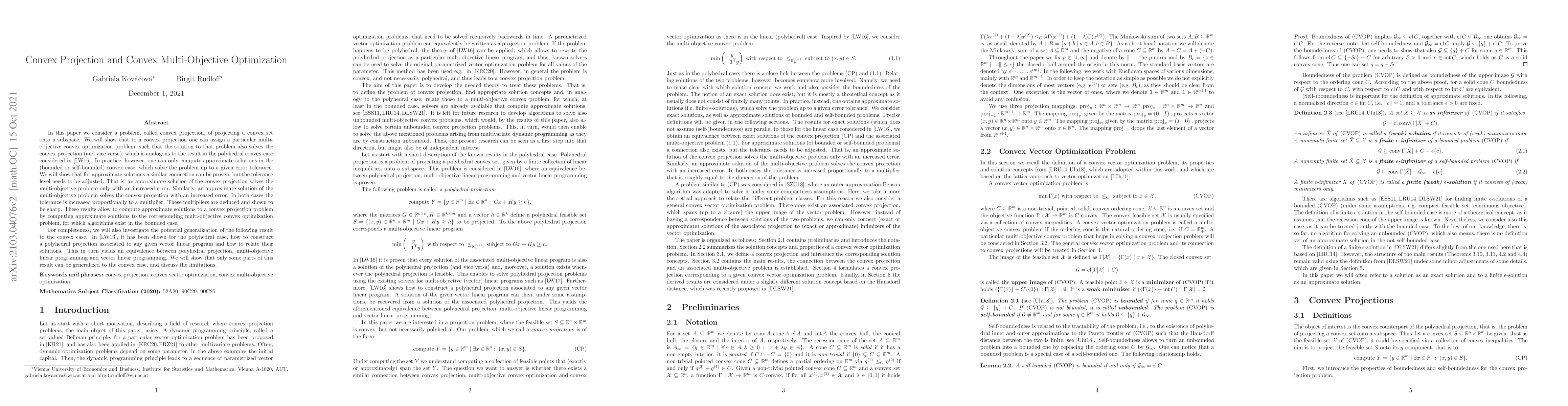 In this paper we consider a problem, called convex projection, of projecting a convex set onto a subspace. We will show that to a convex projection one can assign a particular multi-objective convex optimization problem, such that the solution to that problem also solves the convex projection (and vice versa), which is analogous to the result in the polyhedral convex case considered in arXiv:1507.00228. In practice, however, one can only compute approximate solutions in the (bounded or self-bounded) convex case, which solve the problem up to a given error tolerance. We will show that for approximate solutions a similar connection can be proven, but the tolerance level needs to be adjusted. That is, an approximate solution of the convex projection solves the multi-objective problem only with an increased error. Similarly, an approximate solution of the multi-objective problem solves the convex projection with an increased error. In both cases the tolerance is increased proportionally to a multiplier. These multipliers are deduced and shown to be sharp. These results allow to compute approximate solutions to a convex projection problem by computing approximate solutions to the corresponding multi-objective convex optimization problem, for which algorithms exist in the bounded case. For completeness, we will also investigate the potential generalization of the following result to the convex case. In arXiv:1507.00228, it has been shown for the polyhedral case, how to construct a polyhedral projection associated to any given vector linear program and how to relate their solutions. This in turn yields an equivalence between polyhedral projection, multi-objective linear programming and vector linear programming. We will show that only some parts of this result can be generalized to the convex case, and discuss the limitations.