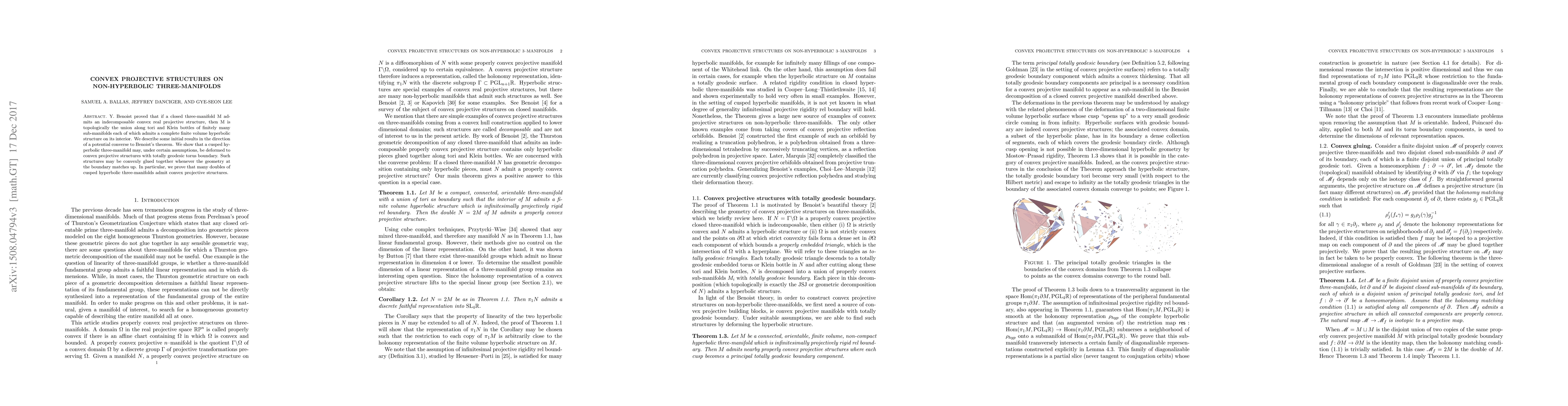 This paper explores the converse of Benoist's theorem on convex projective structures on non-hyperbolic three-manifolds, demonstrating that certain cusped hyperbolic three-manifolds can be deformed into convex projective structures with geodesic torus boundaries, which can be glued together under matching boundary geometries.
