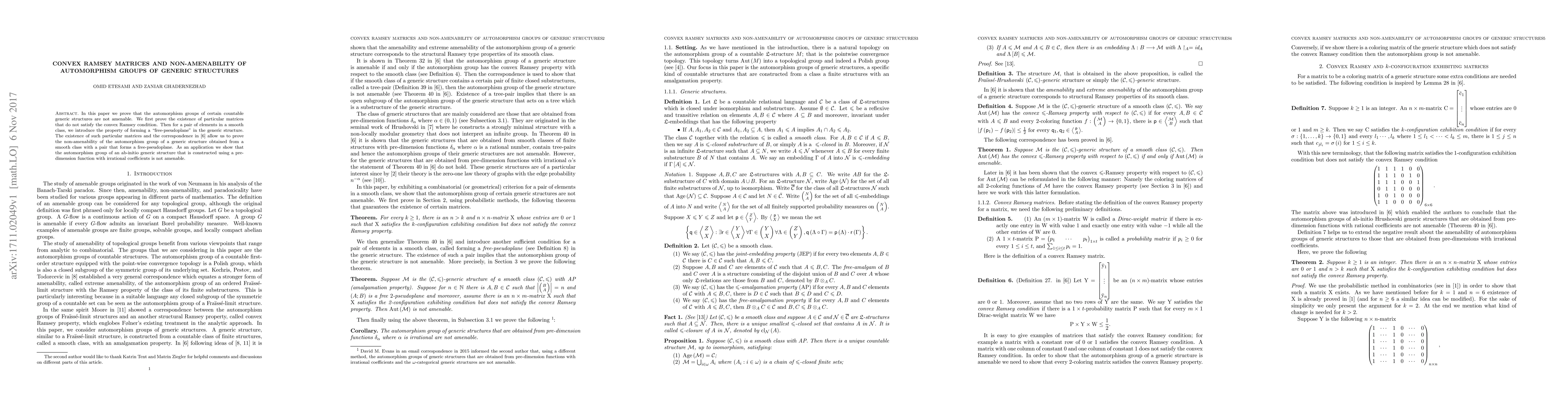 This paper demonstrates that certain automorphism groups of countable generic structures are non-amenable by proving the existence of convex Ramsey matrices that do not satisfy the convex Ramsey condition, and introducing the free-pseudoplane property for specific element pairs. It concludes with an application showing the non-amenability of automorphism groups in ab-initio generic structures with irrational pre-dimension coefficients.
