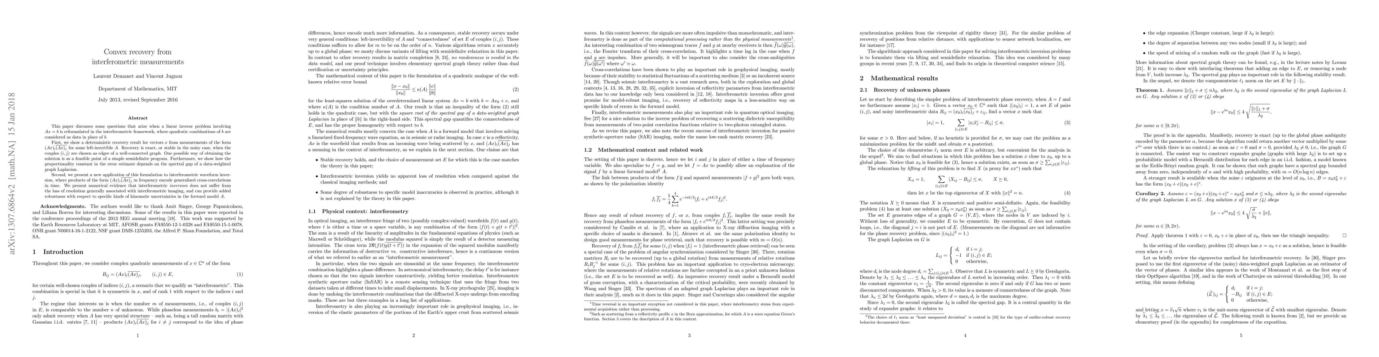 This paper presents a deterministic recovery method for vectors from quadratic interferometric measurements, ensuring exact or stable recovery when measurement pairs form a well-connected graph. The solution is obtained via a semidefinite program, and the error estimate's proportionality constant is linked to the spectral gap of a data-weighted graph Laplacian.