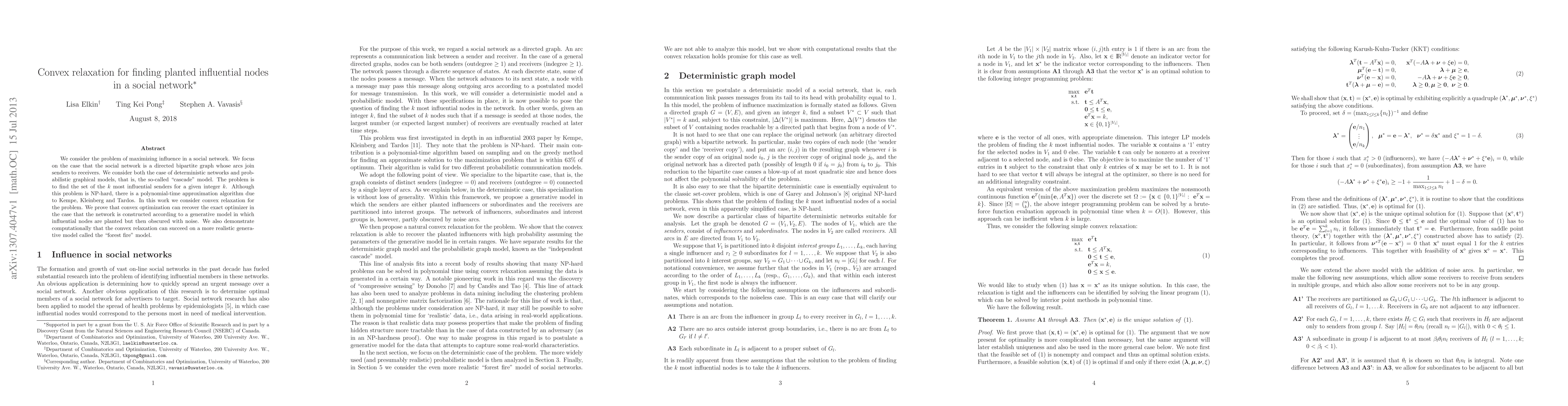 We consider the problem of maximizing influence in a social network. We focus on the case that the social network is a directed bipartite graph whose arcs join senders to receivers. We consider both the case of deterministic networks and probabilistic graphical models, that is, the so-called "cascade" model. The problem is to find the set of the $k$ most influential senders for a given integer $k$. Although this problem is NP-hard, there is a polynomial-time approximation algorithm due to Kempe, Kleinberg and Tardos. In this work we consider convex relaxation for the problem. We prove that convex optimization can recover the exact optimizer in the case that the network is constructed according to a generative model in which influential nodes are planted but then obscured with noise. We also demonstrate computationally that the convex relaxation can succeed on a more realistic generative model called the "forest fire" model.