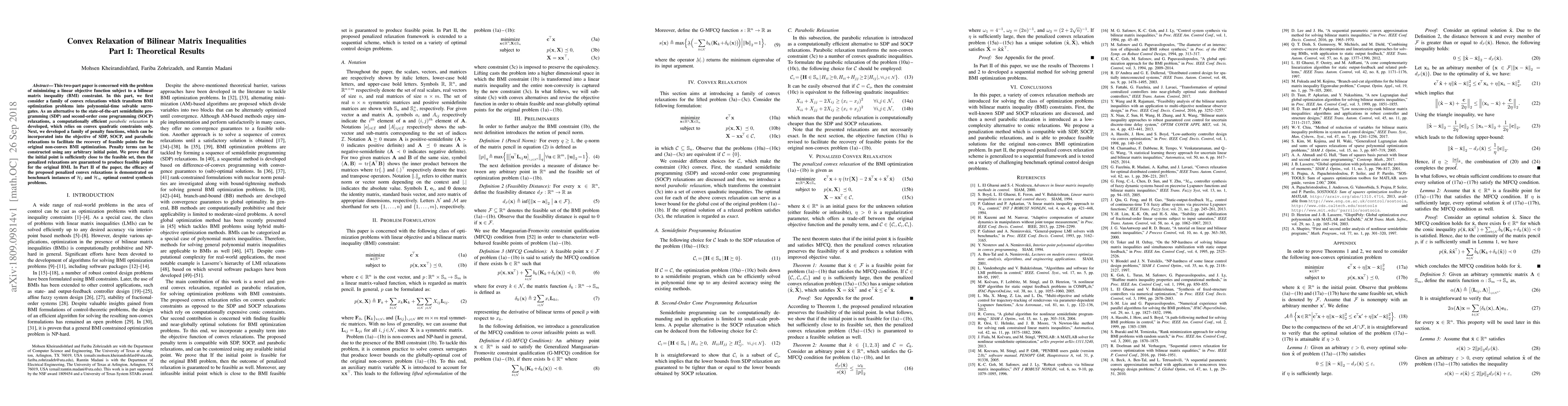 This paper introduces convex relaxations for bilinear matrix inequality (BMI) optimization, proposing a computationally efficient parabolic relaxation and developing penalty functions to recover feasible points for the original BMI. The efficacy of these methods is to be demonstrated in Part II through optimal control synthesis problems.