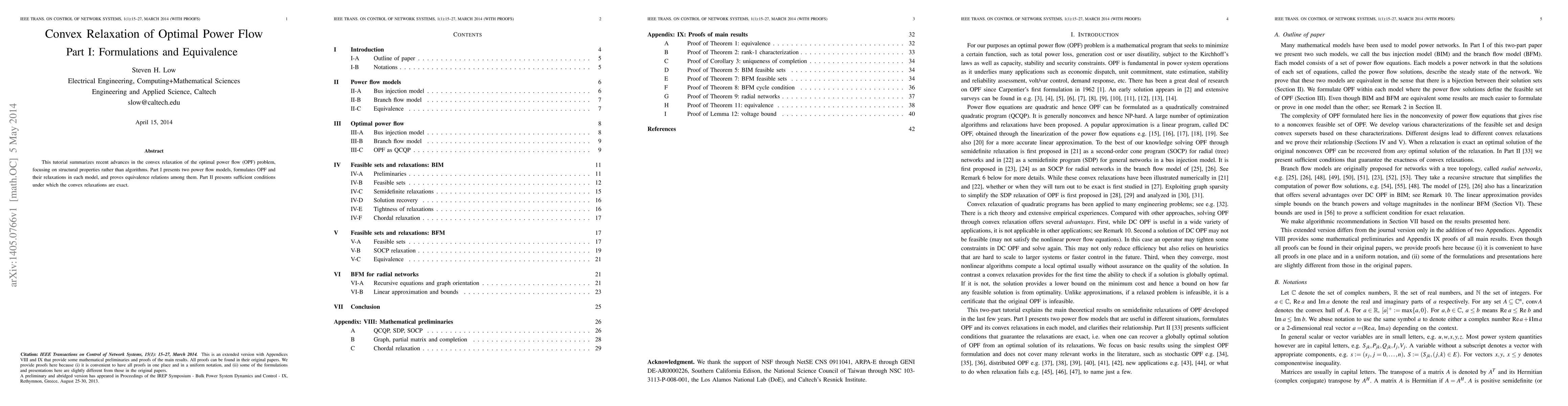 This tutorial summarizes recent advances in the convex relaxation of the optimal power flow (OPF) problem, focusing on structural properties rather than algorithms. Part I presents two power flow models, formulates OPF and their relaxations in each model, and proves equivalence relations among them. Part II presents sufficient conditions under which the convex relaxations are exact.