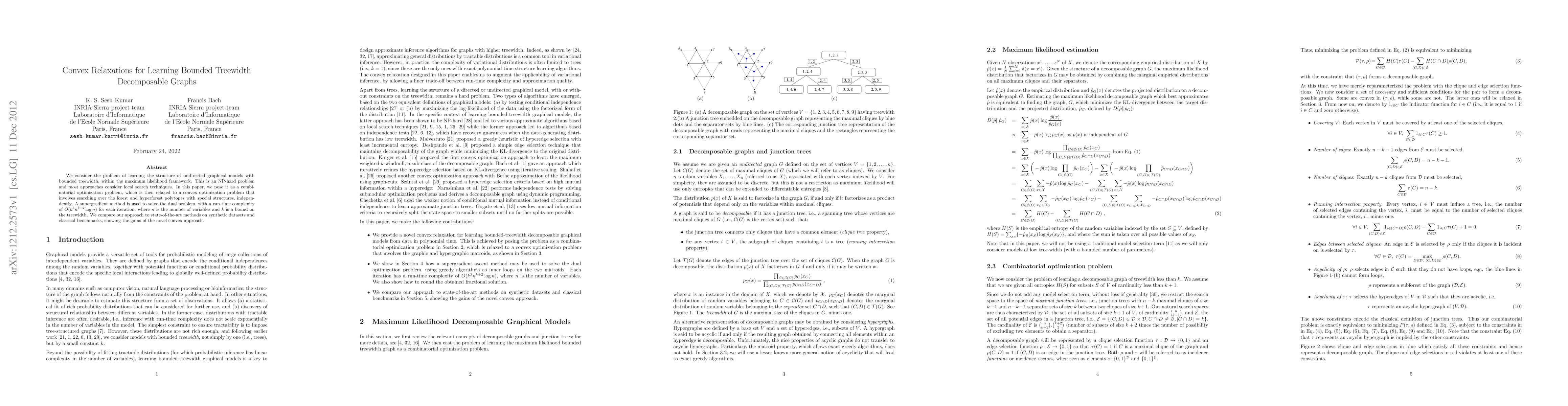We consider the problem of learning the structure of undirected graphical models with bounded treewidth, within the maximum likelihood framework. This is an NP-hard problem and most approaches consider local search techniques. In this paper, we pose it as a combinatorial optimization problem, which is then relaxed to a convex optimization problem that involves searching over the forest and hyperforest polytopes with special structures, independently. A supergradient method is used to solve the dual problem, with a run-time complexity of $O(k^3 n^{k+2} \log n)$ for each iteration, where $n$ is the number of variables and $k$ is a bound on the treewidth. We compare our approach to state-of-the-art methods on synthetic datasets and classical benchmarks, showing the gains of the novel convex approach.