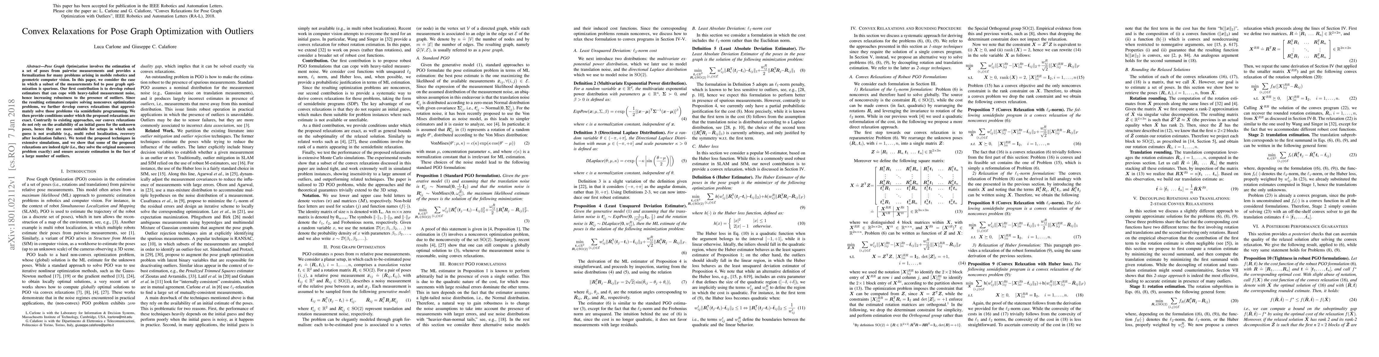 This paper develops robust estimators for pose graph optimization that can handle heavy-tailed measurement noise and outliers. It introduces convex relaxations to solve nonconvex optimization problems via semidefinite programming, providing conditions for exact solutions without requiring an initial pose guess.