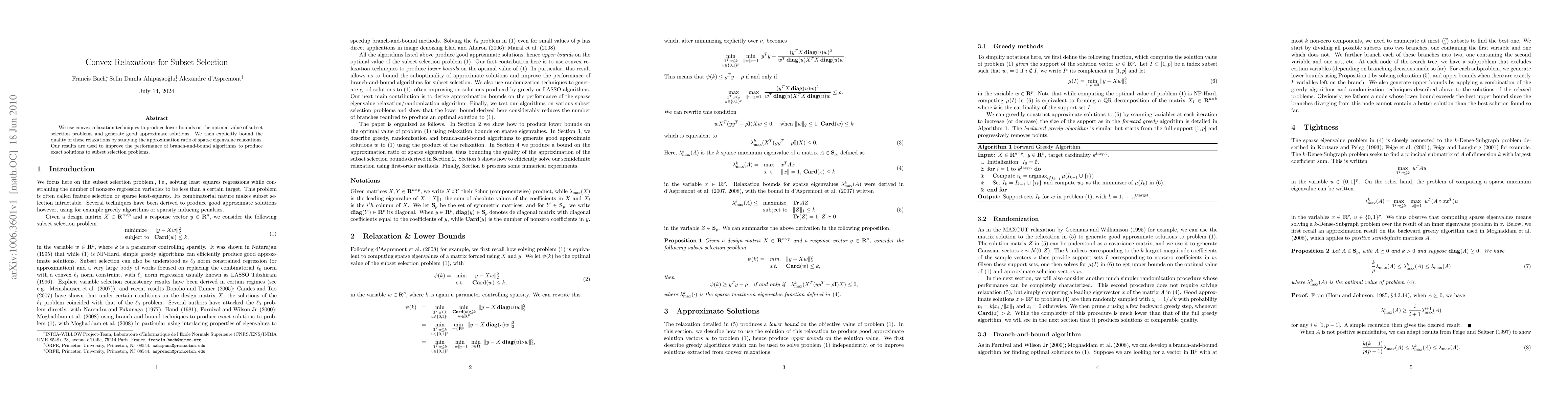 This paper employs convex relaxation techniques to derive lower bounds and approximate solutions for subset selection problems, analyzing the quality of these relaxations through sparse eigenvalue methods. The findings enhance the efficiency of branch-and-bound algorithms for obtaining exact solutions.