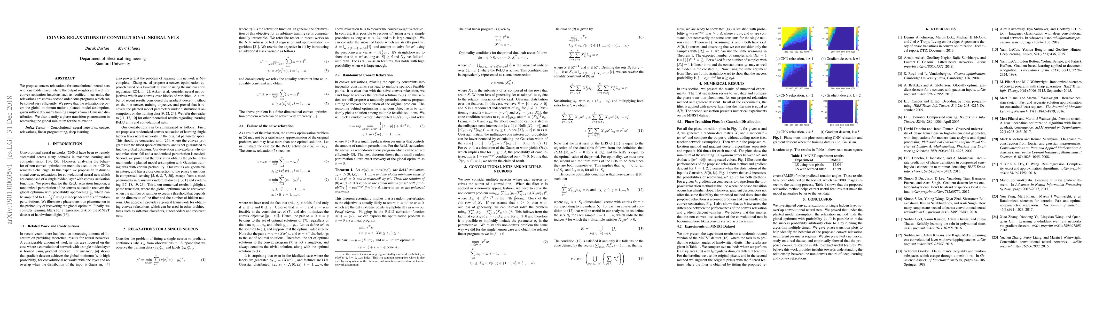 We propose convex relaxations for convolutional neural nets with one hidden layer where the output weights are fixed. For convex activation functions such as rectified linear units, the relaxations are convex second order cone programs which can be solved very efficiently. We prove that the relaxation recovers the global minimum under a planted model assumption, given sufficiently many training samples from a Gaussian distribution. We also identify a phase transition phenomenon in recovering the global minimum for the relaxation.