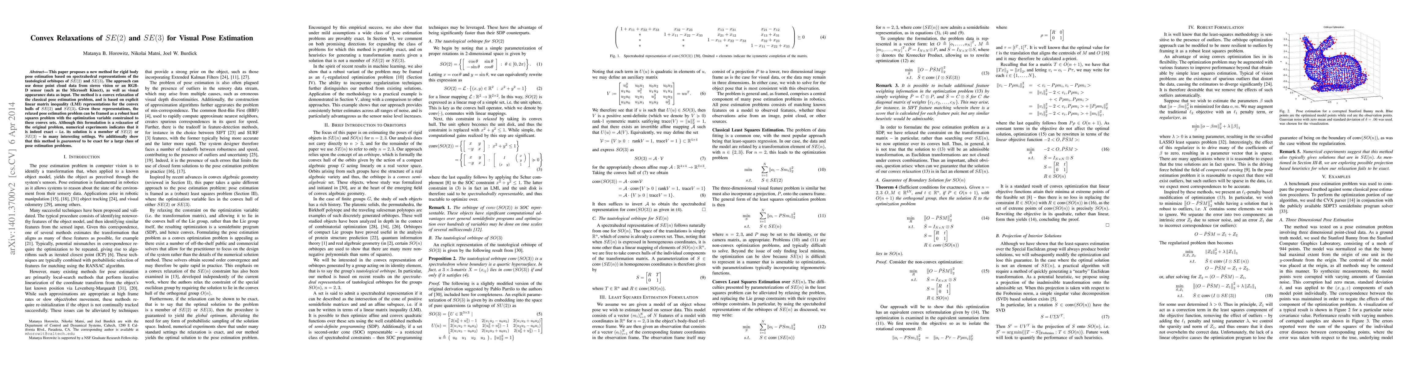 This paper proposes a new method for rigid body pose estimation based on spectrahedral representations of the tautological orbitopes of $SE(2)$ and $SE(3)$. The approach can use dense point cloud data from stereo vision or an RGB-D sensor (such as the Microsoft Kinect), as well as visual appearance data. The method is a convex relaxation of the classical pose estimation problem, and is based on explicit linear matrix inequality (LMI) representations for the convex hulls of $SE(2)$ and $SE(3)$. Given these representations, the relaxed pose estimation problem can be framed as a robust least squares problem with the optimization variable constrained to these convex sets. Although this formulation is a relaxation of the original problem, numerical experiments indicate that it is indeed exact - i.e. its solution is a member of $SE(2)$ or $SE(3)$ - in many interesting settings. We additionally show that this method is guaranteed to be exact for a large class of pose estimation problems.