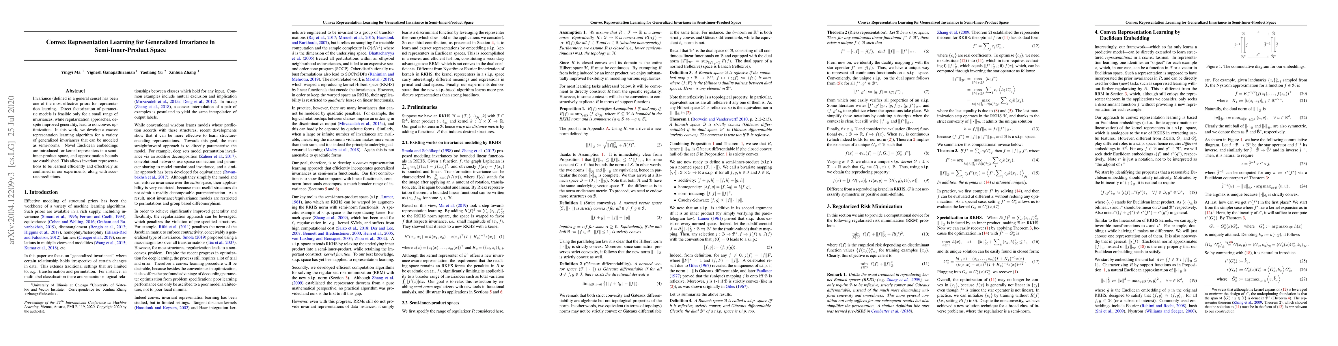 Invariance (defined in a general sense) has been one of the most effective priors for representation learning. Direct factorization of parametric models is feasible only for a small range of invariances, while regularization approaches, despite improved generality, lead to nonconvex optimization. In this work, we develop a convex representation learning algorithm for a variety of generalized invariances that can be modeled as semi-norms. Novel Euclidean embeddings are introduced for kernel representers in a semi-inner-product space, and approximation bounds are established. This allows invariant representations to be learned efficiently and effectively as confirmed in our experiments, along with accurate predictions.