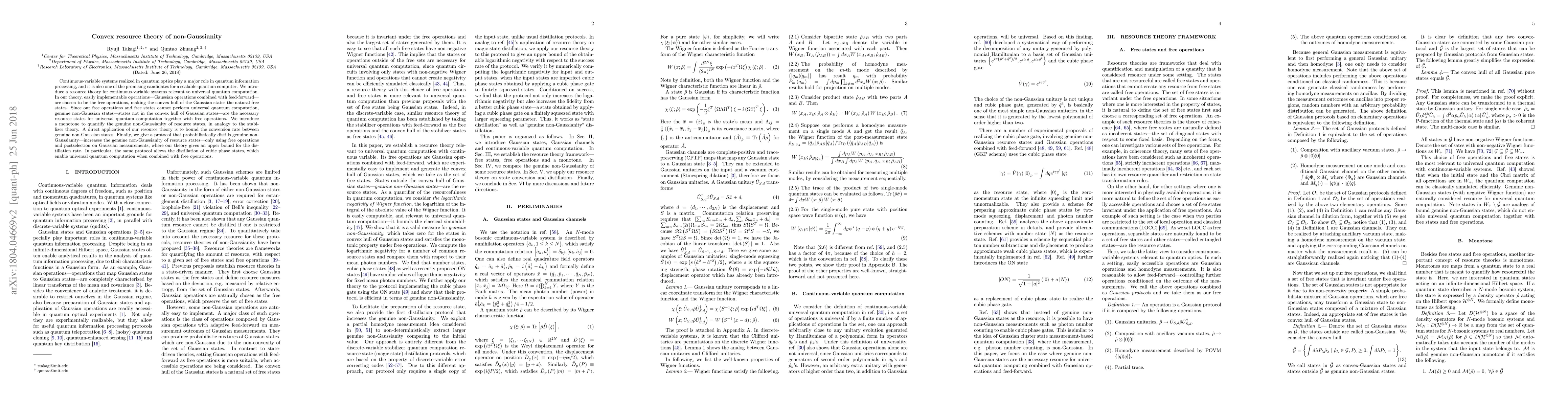 This paper introduces a convex resource theory for continuous-variable systems in quantum optics, focusing on Gaussian operations and feed-forward as free operations. Genuine non-Gaussian states are identified as essential resources for universal quantum computation, and a monotone is introduced to quantify their non-Gaussianity.