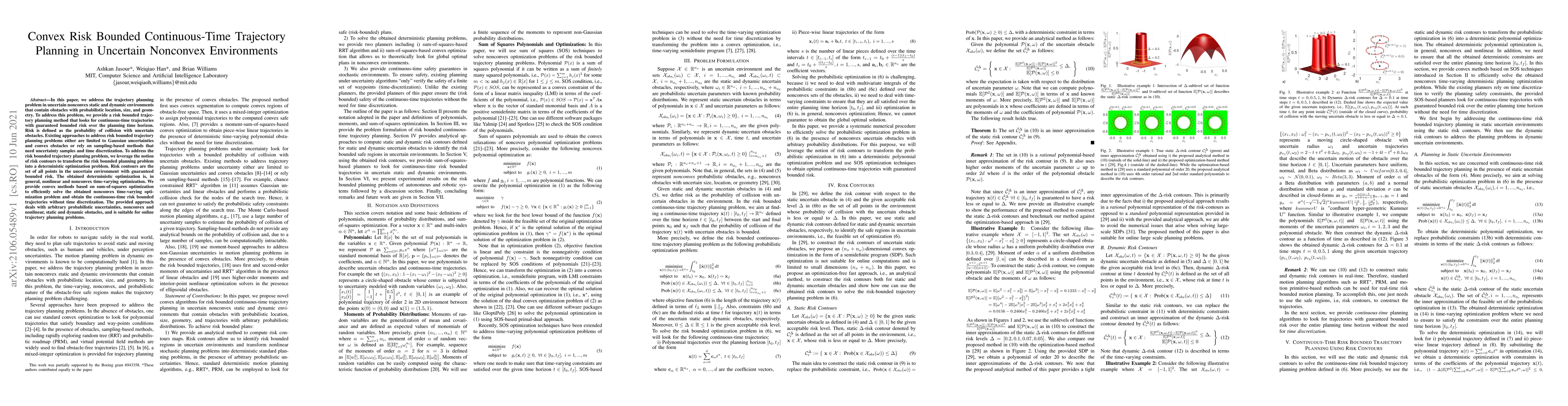 This paper presents a method for continuous-time trajectory planning in uncertain nonconvex environments, ensuring bounded risk through probabilistic obstacle modeling. It leverages risk contours and convex optimization techniques to solve the resulting nonlinear, nonconvex optimization problem without time discretization.