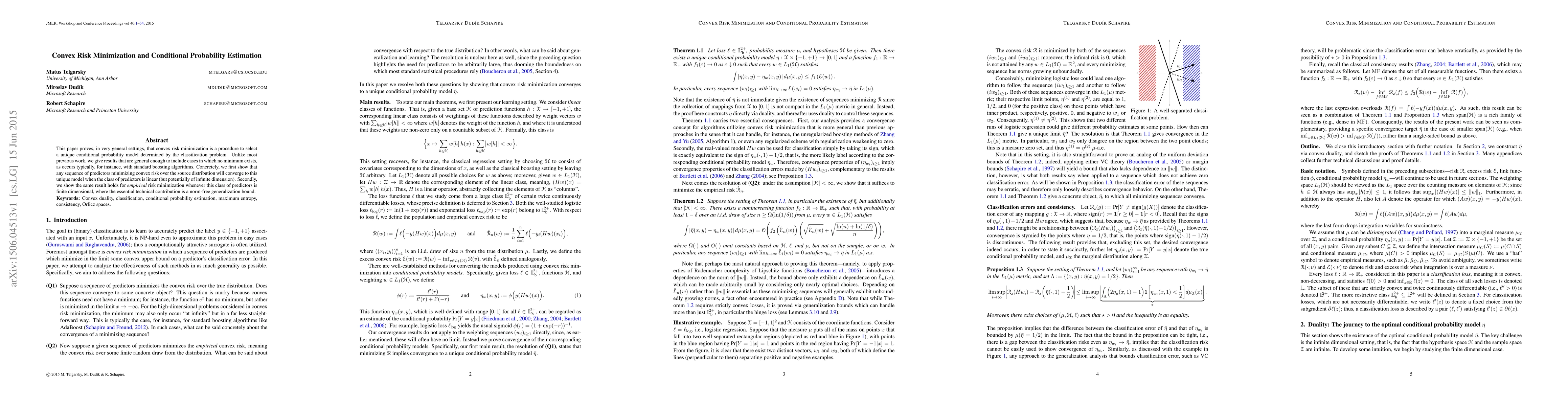 This paper demonstrates that convex risk minimization selects a unique conditional probability model for classification, even when no minimum exists, such as in standard boosting algorithms. It proves convergence to this model for linear predictors and provides a norm-free generalization bound for finite-dimensional predictors.