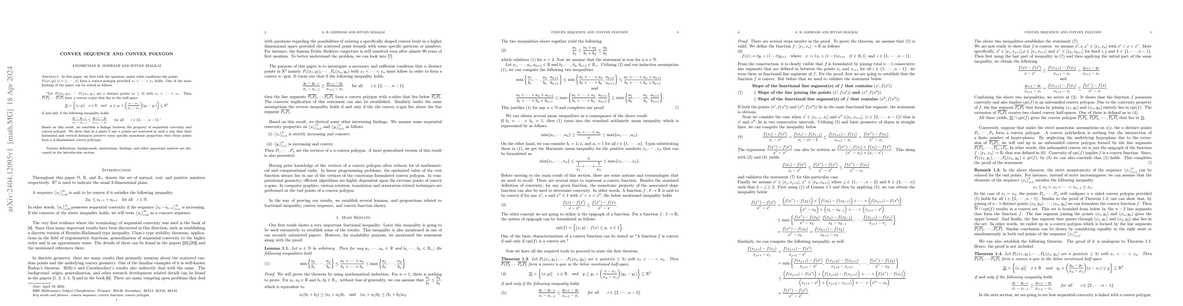 This paper investigates conditions under which a sequence of points $P_i(x_i,y_i)$ with $x_1 < \cdots < x_n$ forms a convex polygon. It concludes that these points form a convex $n$-gon if the slope condition $y_i-y_{i-1}/(x_i-x_{i-1}) \leq y_{i+1}-y_i/(x_{i+1}-x_i)$ holds for all $i$ in $\{2,\cdots,n-1\}$.