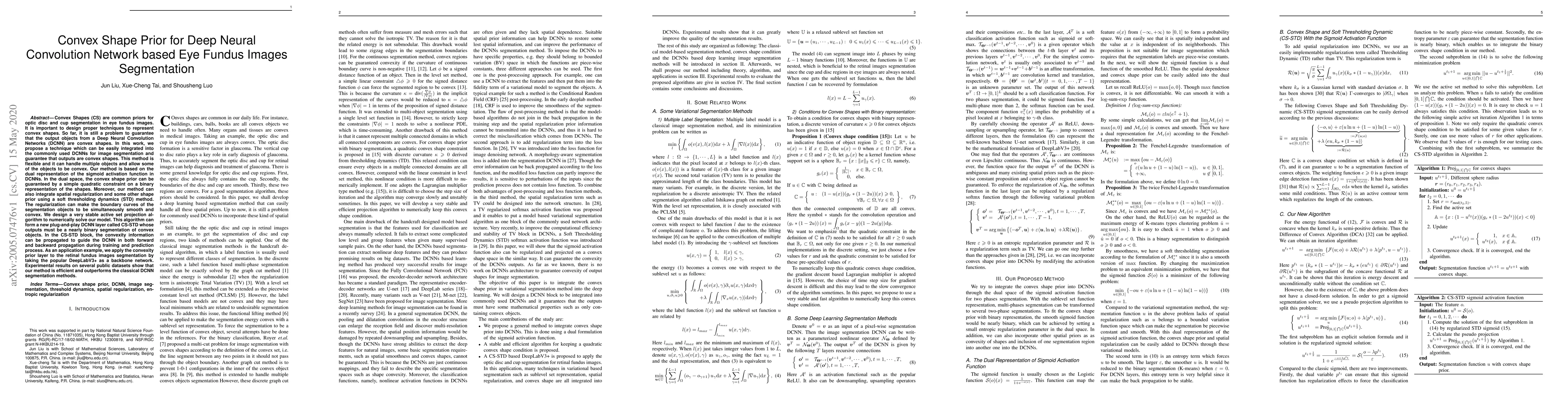 Convex Shapes (CS) are common priors for optic disc and cup segmentation in eye fundus images. It is important to design proper techniques to represent convex shapes. So far, it is still a problem to guarantee that the output objects from a Deep Neural Convolution Networks (DCNN) are convex shapes. In this work, we propose a technique which can be easily integrated into the commonly used DCNNs for image segmentation and guarantee that outputs are convex shapes. This method is flexible and it can handle multiple objects and allow some of the objects to be convex. Our method is based on the dual representation of the sigmoid activation function in DCNNs. In the dual space, the convex shape prior can be guaranteed by a simple quadratic constraint on a binary representation of the shapes. Moreover, our method can also integrate spatial regularization and some other shape prior using a soft thresholding dynamics (STD) method. The regularization can make the boundary curves of the segmentation objects to be simultaneously smooth and convex. We design a very stable active set projection algorithm to numerically solve our model. This algorithm can form a new plug-and-play DCNN layer called CS-STD whose outputs must be a nearly binary segmentation of convex objects. In the CS-STD block, the convexity information can be propagated to guide the DCNN in both forward and backward propagation during training and prediction process. As an application example, we apply the convexity prior layer to the retinal fundus images segmentation by taking the popular DeepLabV3+ as a backbone network. Experimental results on several public datasets show that our method is efficient and outperforms the classical DCNN segmentation methods.