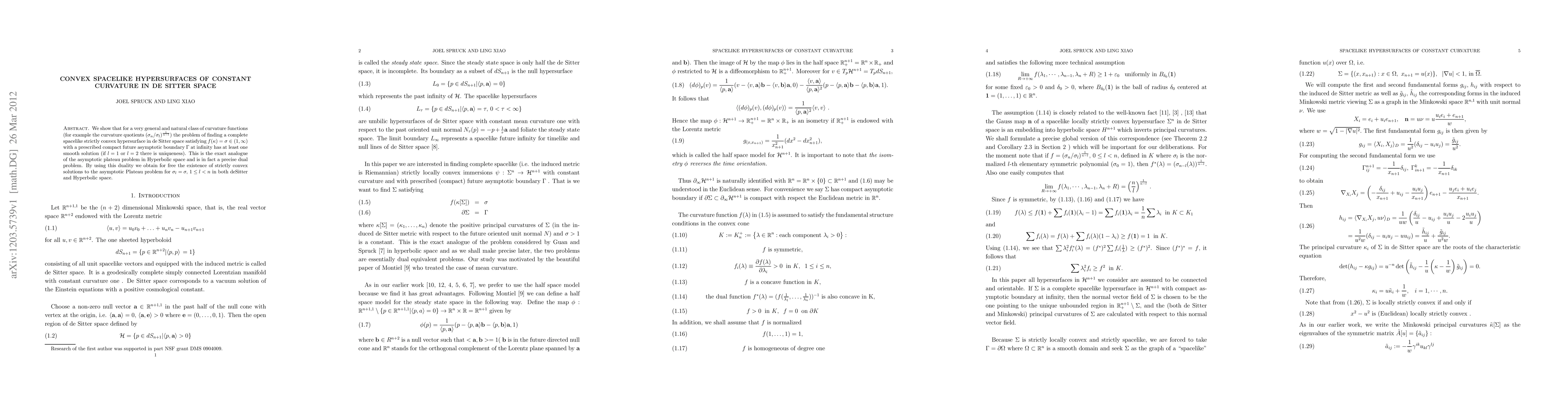 We show that for a very general and natural class of curvature functions (for example the curvature quotients $(\sigma_n/\sigma_l)^{\frac{1}{n-l}}$) the problem of finding a complete spacelike strictly convex hypersurface in de Sitter space satisfying $f(\kappa) = \sigma \in (1,\infty)$ with a prescribed compact future asymptotic boundary $\Gamma$ at infinity has at least one smooth solution (if l = 1 or l = 2 there is uniqueness). This is the exact analogue of the asymptotic plateau problem in Hyperbolic space and is in fact a precise dual problem. By using this duality we obtain for free the existence of strictly convex solutions to the asymptotic Plateau problem for $\sigma_l = \sigma$; $1\leq l < n$ in both deSitter and Hyperbolic space.