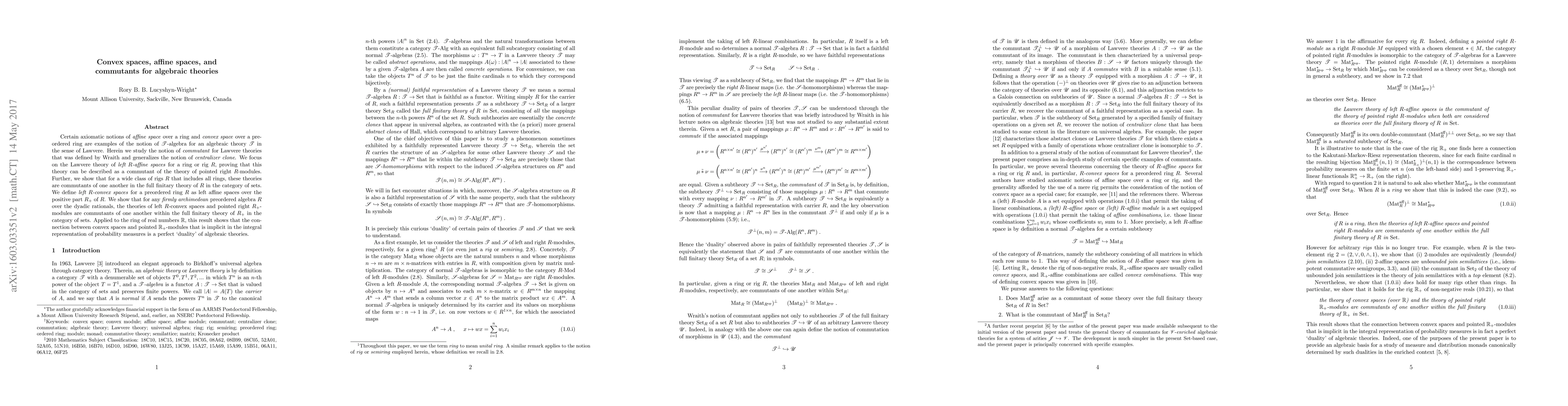 The paper explores the algebraic theory of affine and convex spaces as $\mathcal{T}$-algebras and introduces the concept of commutants for Lawvere theories. It proves that the theory of left $R$-affine spaces can be described as a commutant of pointed right $R$-modules, and demonstrates that these theories are commutants of each other for a broad class of rigs $R$. The study also shows a duality between left $R$-convex spaces and pointed right $R_+$-modules for firmly archimedean preordered algebras over dyadic rationals, revealing an algebraic connection between convex spaces and probability measures.