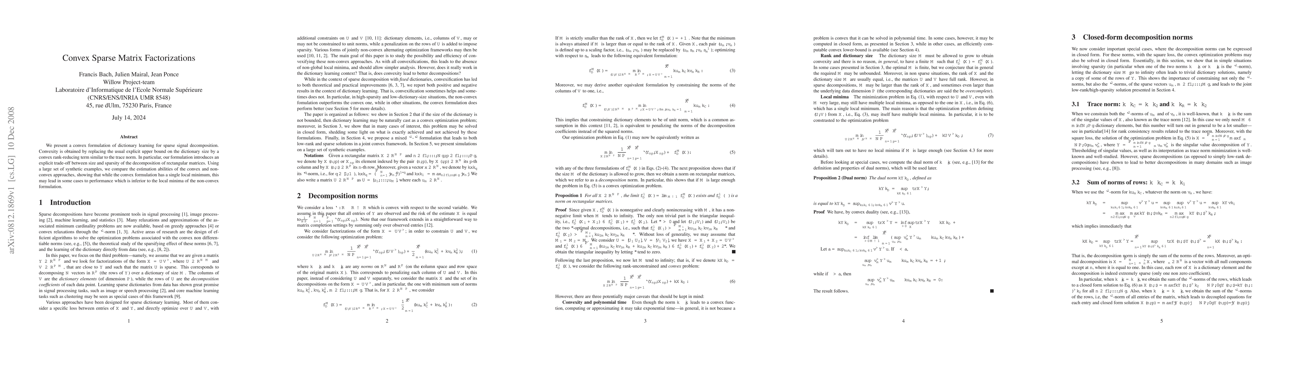 We present a convex formulation of dictionary learning for sparse signal decomposition. Convexity is obtained by replacing the usual explicit upper bound on the dictionary size by a convex rank-reducing term similar to the trace norm. In particular, our formulation introduces an explicit trade-off between size and sparsity of the decomposition of rectangular matrices. Using a large set of synthetic examples, we compare the estimation abilities of the convex and non-convex approaches, showing that while the convex formulation has a single local minimum, this may lead in some cases to performance which is inferior to the local minima of the non-convex formulation.