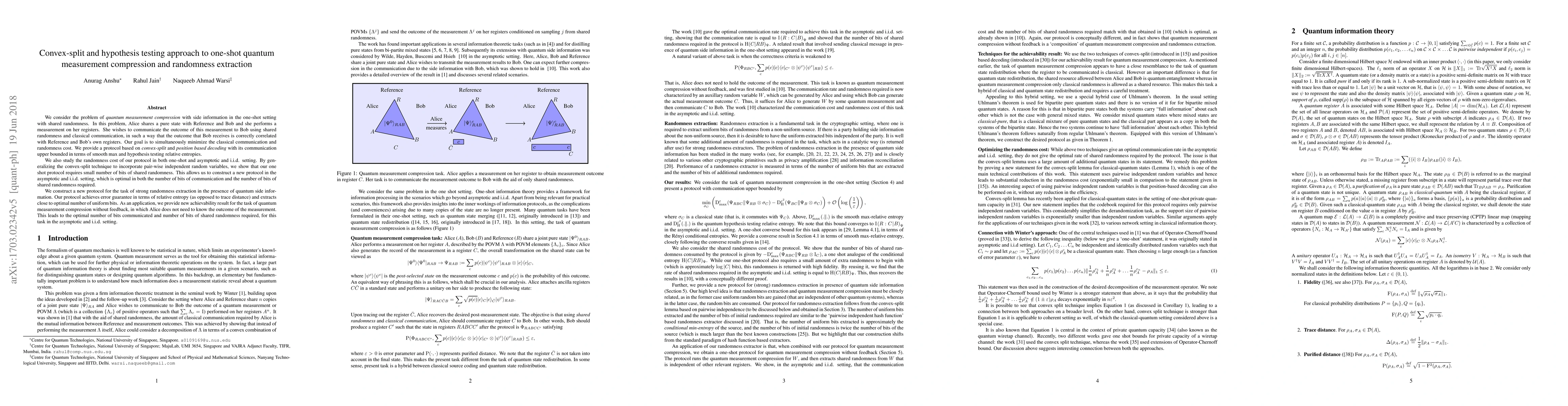 This paper proposes a novel protocol for one-shot quantum measurement compression and randomness extraction using shared randomness and classical communication, minimizing both communication and randomness costs. The protocol leverages convex-split techniques and hypothesis testing, achieving optimal results in both one-shot and asymptotic settings.