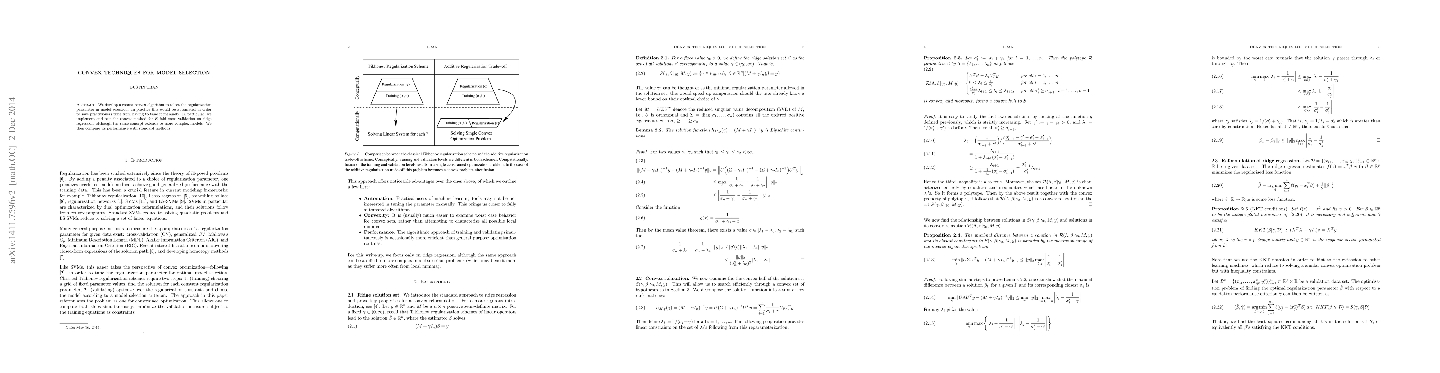 We develop a robust convex algorithm to select the regularization parameter in model selection. In practice this would be automated in order to save practitioners time from having to tune it manually. In particular, we implement and test the convex method for $K$-fold cross validation on ridge regression, although the same concept extends to more complex models. We then compare its performance with standard methods.