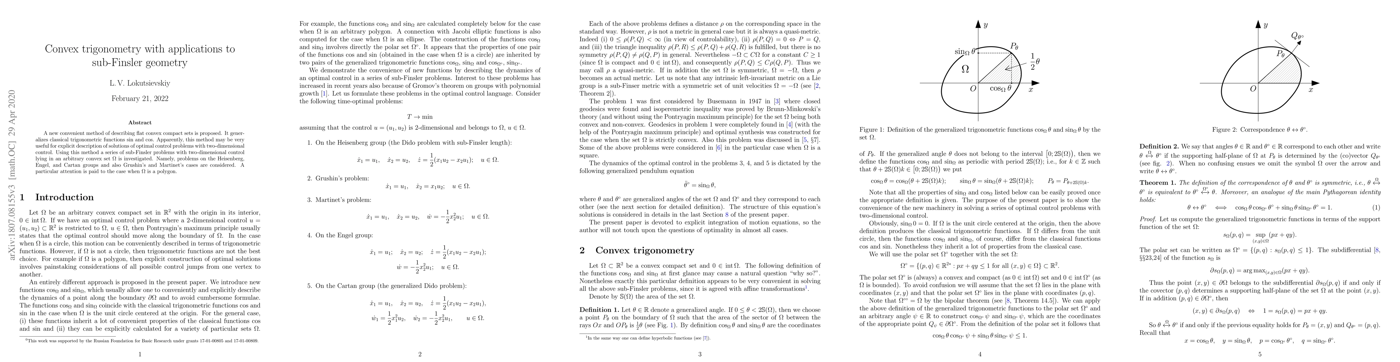 A new convenient method of describing flat convex compact sets is proposed. It generalizes classical trigonometric functions $\sin$ and $\cos$. Apparently, this method may be very useful for explicit description of solutions of optimal control problems with two-dimensional control. Using this method a series of sub-Finsler problems with two-dimensional control lying in an arbitrary convex set $\Omega$ is investigated. Namely, problems on the Heisenberg, Engel, and Cartan groups and also Grushin's and Martinet's cases are considered. A particular attention is paid to the case when $\Omega$ is a polygon.