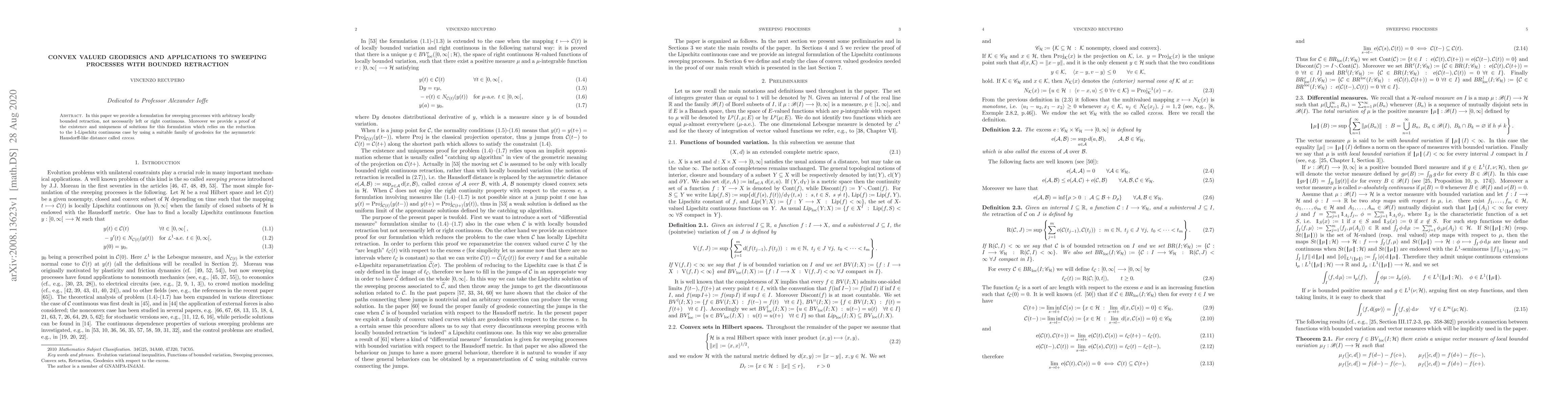 This paper formulates sweeping processes with locally bounded retractions, proving the existence and uniqueness of solutions by reducing to the 1-Lipschitz continuous case via convex valued geodesics defined for an asymmetric Hausdorff-like distance termed "excess".
