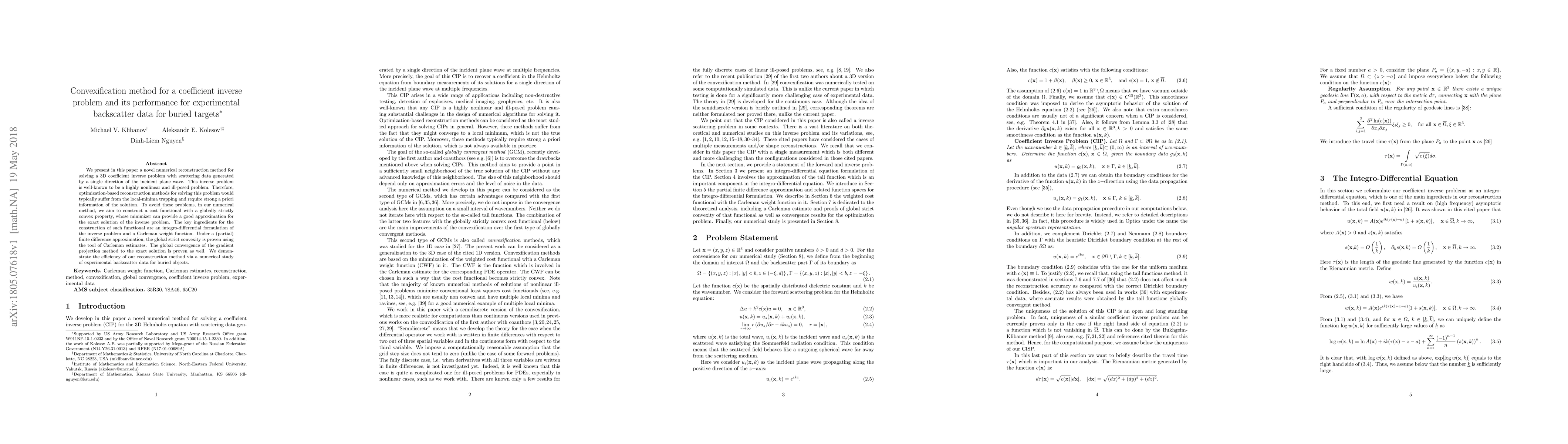 This paper introduces a convexification method for solving a 3D coefficient inverse problem using scattering data, aiming to avoid local minima and strong a priori information. The method constructs a globally strictly convex cost functional, proven via Carleman estimates and gradient projection, and demonstrates its effectiveness on experimental backscatter data for buried targets.