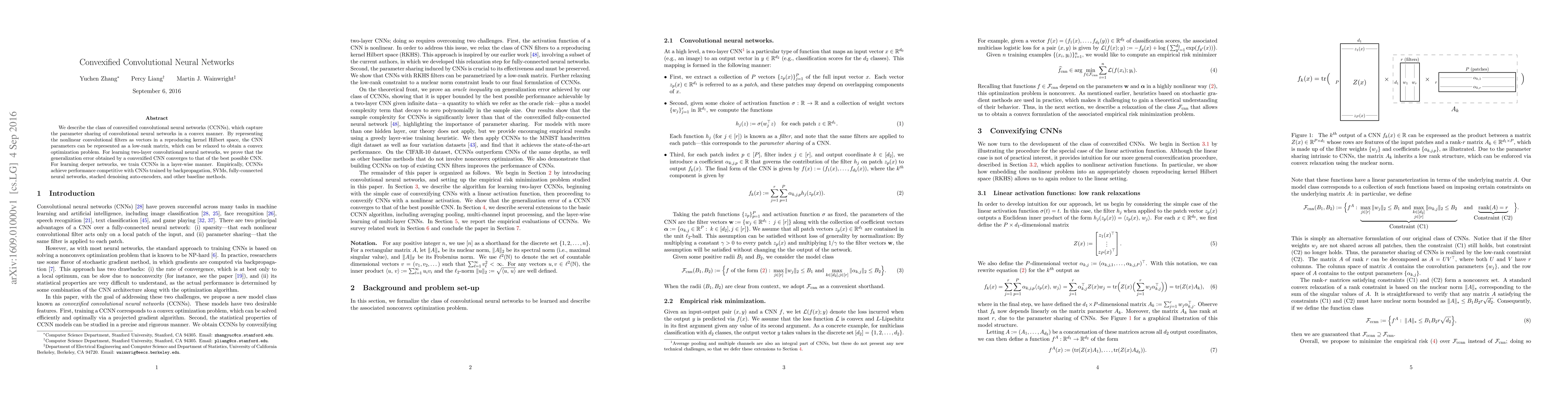This paper introduces convexified convolutional neural networks (CCNNs) that represent CNN parameters as a low-rank matrix in a convex optimization framework. The authors prove that CCNNs can achieve generalization error comparable to traditional CNNs, and demonstrate competitive performance through empirical evaluations against various baseline methods.