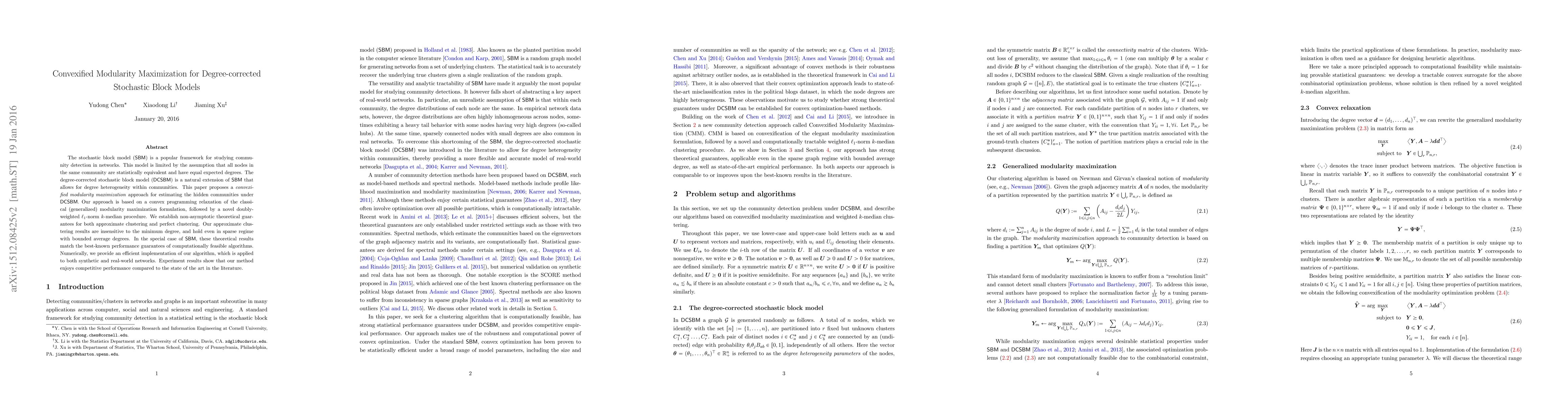 This paper proposes a convexified modularity maximization approach for estimating communities in degree-corrected stochastic block models, which allows for degree heterogeneity within communities. The method uses a convex programming relaxation and a novel doubly-weighted $ \ell_1 $-norm $ k $-median procedure, providing theoretical guarantees for both approximate and perfect clustering, and competitive performance in numerical experiments.