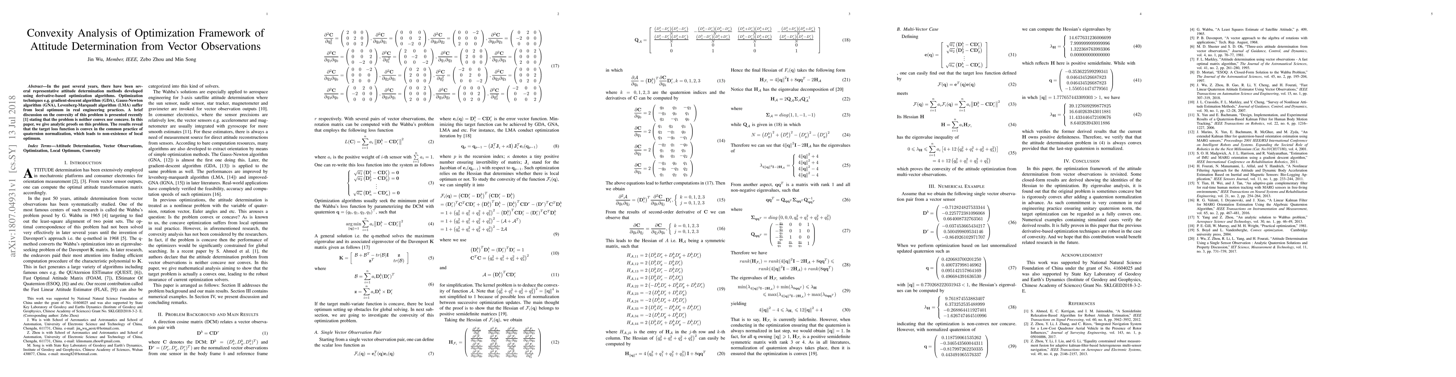 This paper provides analytic proofs confirming that the attitude determination problem from vector observations is not convex or concave, but the loss function becomes convex under quaternion normalization, eliminating the risk of local optima in optimization techniques like gradient-descent or Gauss-Newton algorithms.