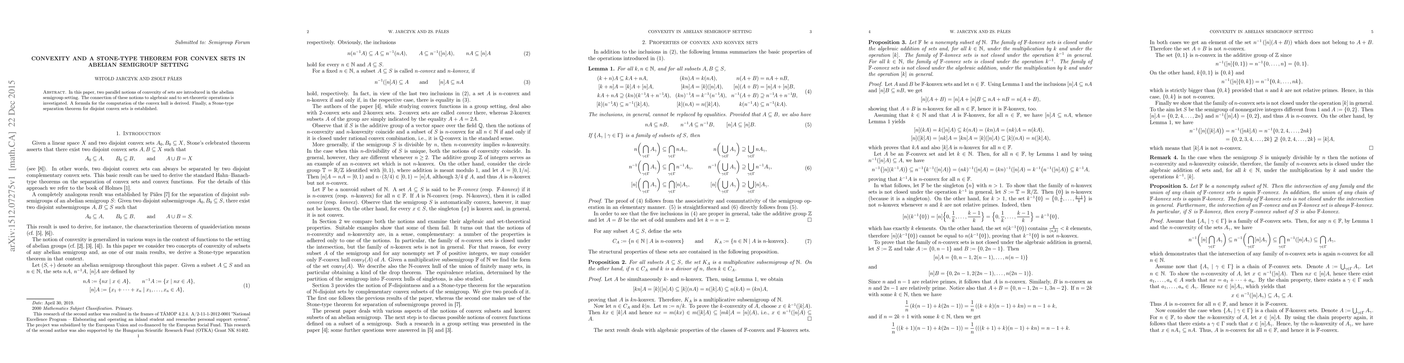 This paper introduces two notions of convexity in abelian semigroups, explores their algebraic and set-theoretic connections, derives a formula for computing the convex hull, and establishes a Stone-type separation theorem for disjoint convex sets.