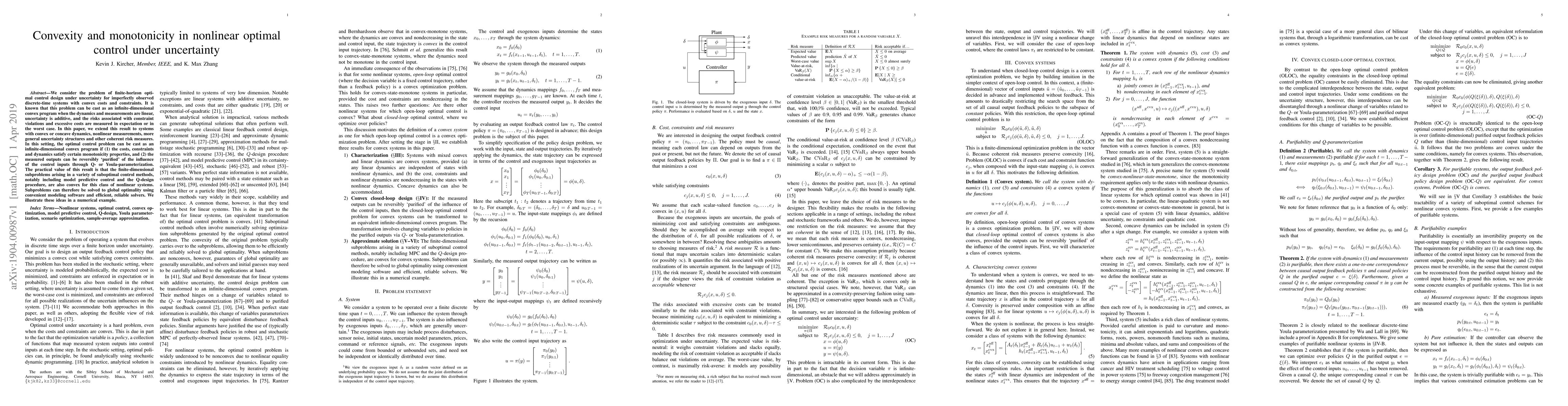 We consider the problem of finite-horizon optimal control design under uncertainty for imperfectly observed discrete-time systems with convex costs and constraints. It is known that this problem can be cast as an infinite-dimensional convex program when the dynamics and measurements are linear, uncertainty is additive, and the risks associated with constraint violations and excessive costs are measured in expectation or in the worst case. In this paper, we extend this result to systems with convex or concave dynamics, nonlinear measurements, more general uncertainty structures and other coherent risk measures. In this setting, the optimal control problem can be cast as an infinite-dimensional convex program if (1) the costs, constraints and dynamics satisfy certain monotonicity properties, and (2) the measured outputs can be reversibly `purified' of the influence of the control inputs through Q- or Youla-parameterization. The practical value of this result is that the finite-dimensional subproblems arising in a variety of suboptimal control methods, notably including model predictive control and the Q-design procedure, are also convex for this class of nonlinear systems. Subproblems can therefore be solved to global optimality using convenient modeling software and efficient, reliable solvers. We illustrate these ideas in a numerical example.