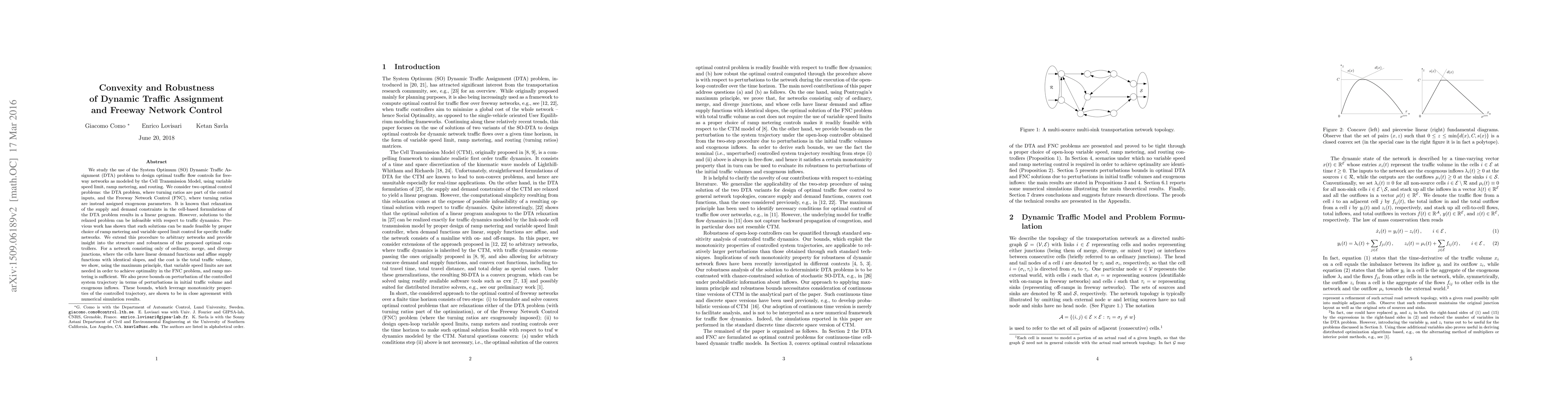 We study the use of the System Optimum (SO) Dynamic Traffic Assignment (DTA) problem to design optimal traffic flow controls for freeway networks as modeled by the Cell Transmission Model, using variable speed limit, ramp metering, and routing. We consider two optimal control problems: the DTA problem, where turning ratios are part of the control inputs, and the Freeway Network Control (FNC), where turning ratios are instead assigned exogenous parameters. It is known that relaxation of the supply and demand constraints in the cell-based formulations of the DTA problem results in a linear program. However, solutions to the relaxed problem can be infeasible with respect to traffic dynamics. Previous work has shown that such solutions can be made feasible by proper choice of ramp metering and variable speed limit control for specific traffic networks. We extend this procedure to arbitrary networks and provide insight into the structure and robustness of the proposed optimal controllers. For a network consisting only of ordinary, merge, and diverge junctions, where the cells have linear demand functions and affine supply functions with identical slopes, and the cost is the total traffic volume, we show, using the maximum principle, that variable speed limits are not needed in order to achieve optimality in the FNC problem, and ramp metering is sufficient. We also prove bounds on perturbation of the controlled system trajectory in terms of perturbations in initial traffic volume and exogenous inflows. These bounds, which leverage monotonicity properties of the controlled trajectory, are shown to be in close agreement with numerical simulation results.