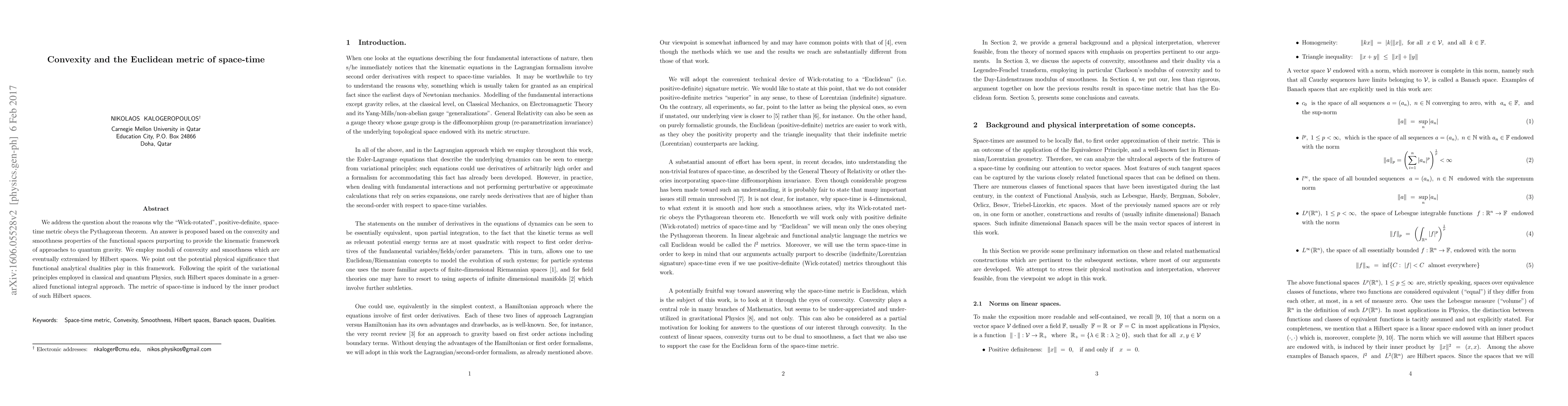 We address the question about the reasons why the "Wick-rotated", positive-definite, space-time metric obeys the Pythagorean theorem. An answer is proposed based on the convexity and smoothness properties of the functional spaces purporting to provide the kinematic framework of approaches to quantum gravity. We employ moduli of convexity and smoothness which are eventually extremized by Hilbert spaces. We point out the potential physical significance that functional analytical dualities play in this framework. Following the spirit of the variational principles employed in classical and quantum Physics, such Hilbert spaces dominate in a generalized functional integral approach. The metric of space-time is induced by the inner product of such Hilbert spaces.