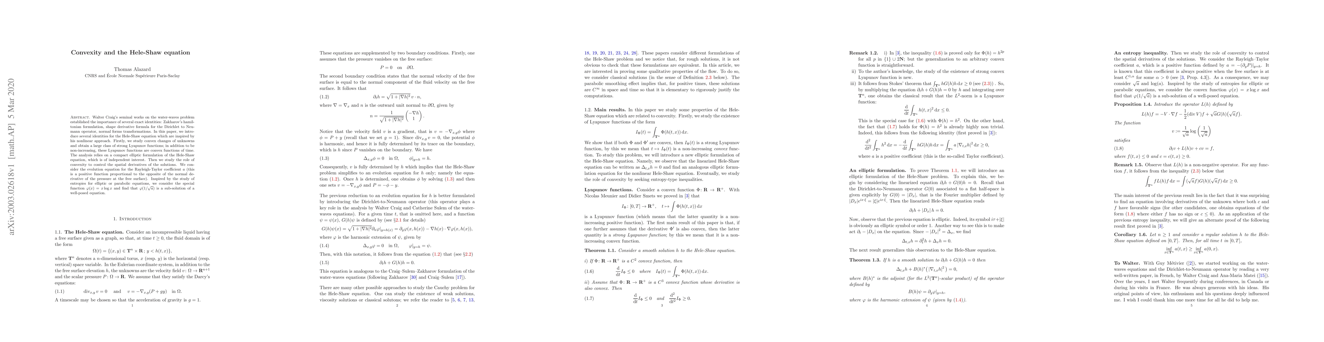 This paper introduces new identities for the Hele-Shaw equation inspired by Walter Craig's nonlinear approach, focusing on convex changes of unknowns and the construction of strong Lyapounov functions. It also explores the role of convexity in controlling spatial derivatives, using the Rayleigh-Taylor coefficient and a sub-solution function to provide a new proof for the maximum principle.