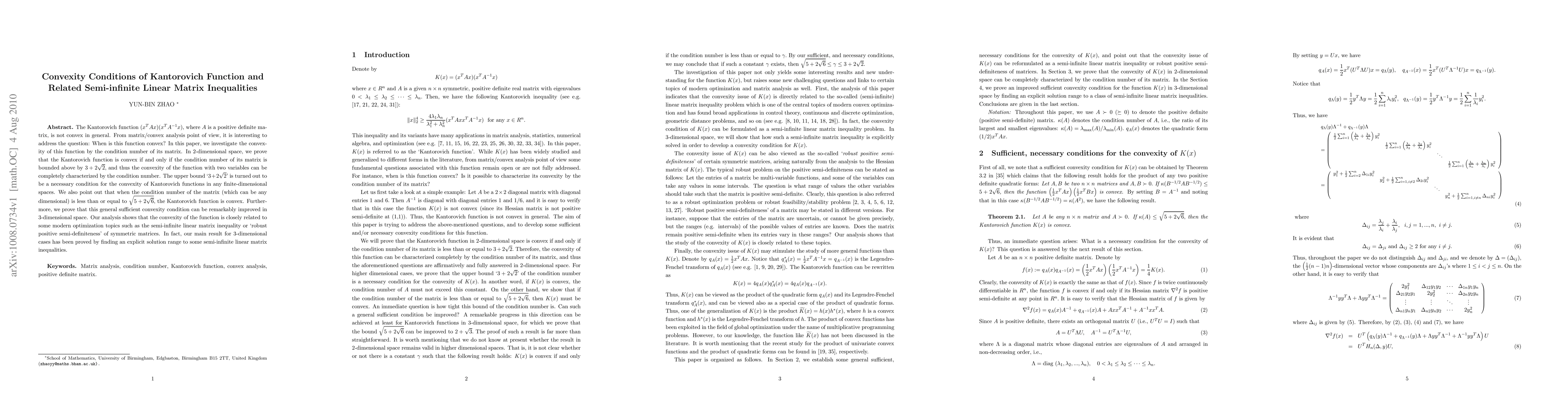 The Kantorovich function $(x^TAx)(x^T A^{-1} x)$, where $A$ is a positive definite matrix, is not convex in general. From matrix/convex analysis point of view, it is interesting to address the question: When is this function convex? In this paper, we investigate the convexity of this function by the condition number of its matrix. In 2-dimensional space, we prove that the Kantorovich function is convex if and only if the condition number of its matrix is bounded above by $3+2\sqrt{2}, $ and thus the convexity of the function with two variables can be completely characterized by the condition number. The upper bound `$3+2\sqrt{2} $' is turned out to be a necessary condition for the convexity of Kantorovich functions in any finite-dimensional spaces. We also point out that when the condition number of the matrix (which can be any dimensional) is less than or equal to $\sqrt{5+2\sqrt{6}}, $ the Kantorovich function is convex. Furthermore, we prove that this general sufficient convexity condition can be remarkably improved in 3-dimensional space. Our analysis shows that the convexity of the function is closely related to some modern optimization topics such as the semi-infinite linear matrix inequality or 'robust positive semi-definiteness' of symmetric matrices. In fact, our main result for 3-dimensional cases has been proved by finding an explicit solution range to some semi-infinite linear matrix inequalities.