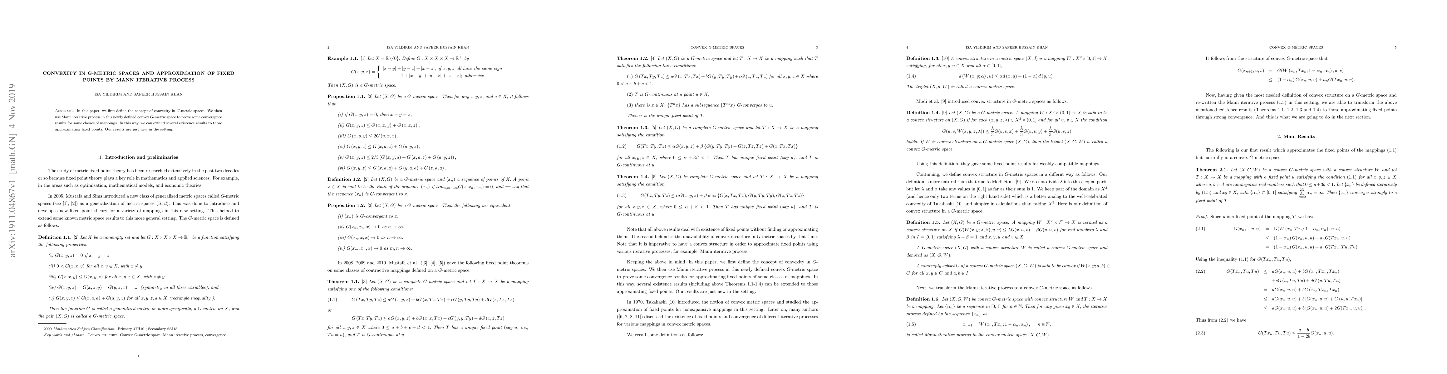 In this paper, we first define the concept of convexity in G-metric spaces. We then use Mann iterative process in this newly defined convex G-metric space to prove some convergence results for some classes of mappings. In this way, we can extend several existence results to those approximating fixed points. Our results are just new in the setting.