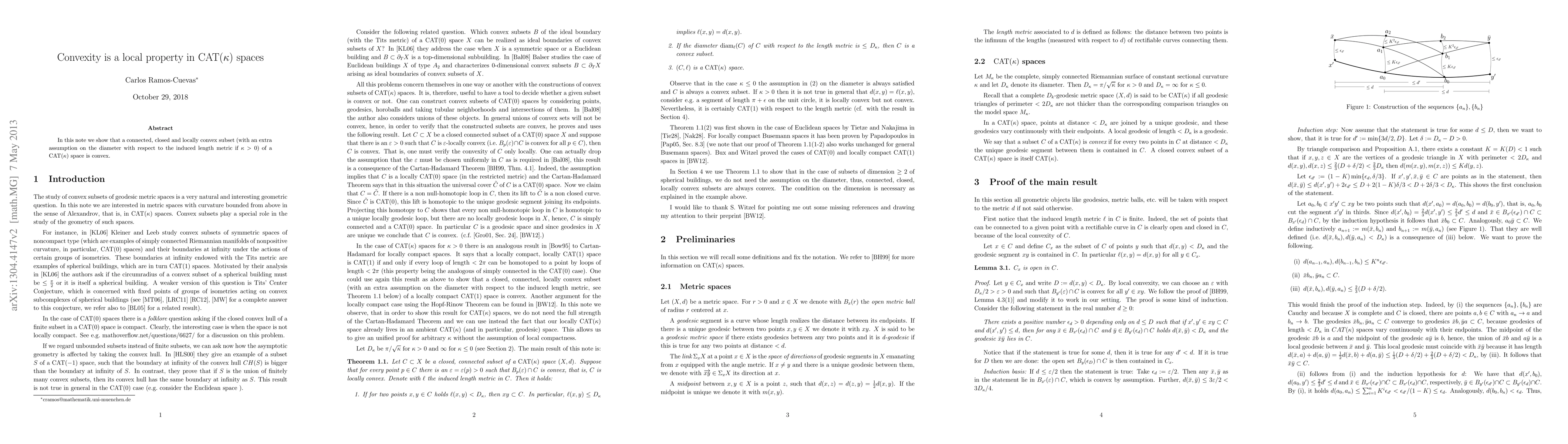 Summary: This paper demonstrates that in a $CAT(\kappa)$ space, a connected, closed, and locally convex subset is convex, provided it meets a specific diameter condition when $\kappa>0$. Convexity is shown to be a local property in these spaces.