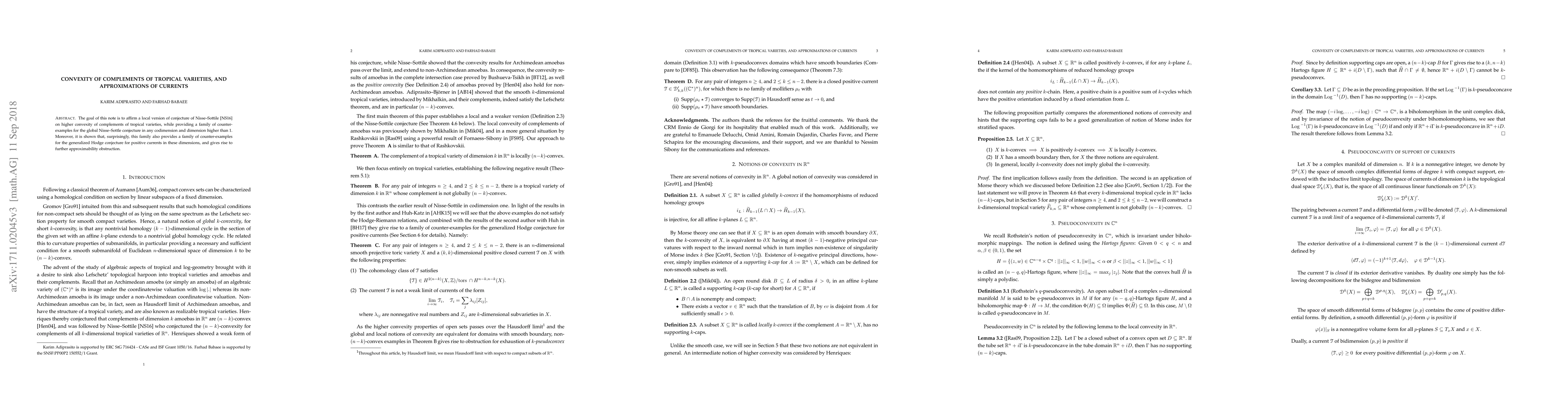 The goal of this note is to affirm a local version of the conjecture of Nisse--Sottile [NS16] on higher convexity of complements of tropical varieties, while providing a family of counter-examples for the global Nisse--Sottle conjecture in any codimension and dimension higher than 1. Moreover, it will be shown that, surprisingly, this family also provides a family of counter-examples for the generalized Hodge conjecture for positive currents in these dimensions, and gives rise to further approximability obstruction.