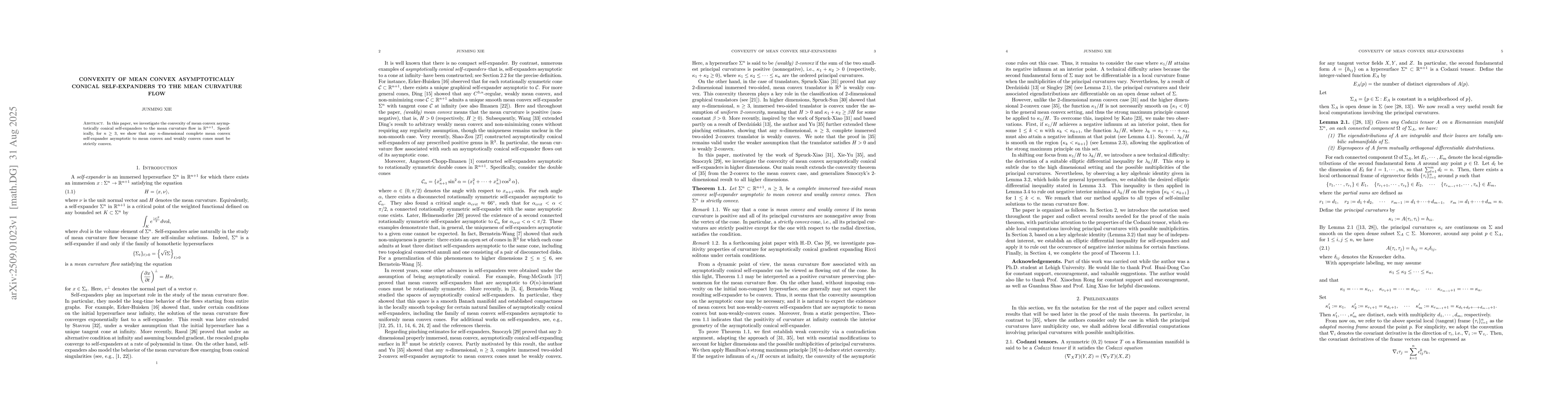 In this paper, we investigate the convexity of mean convex asymptotically conical self-expanders to the mean curvature flow in $\mathbb{R}^{n+1}$. Specifically, for $n\geq 3$, we show that any $n$-dimensional complete mean convex self-expander asymptotic to mean convex and weakly convex cones must be strictly convex.