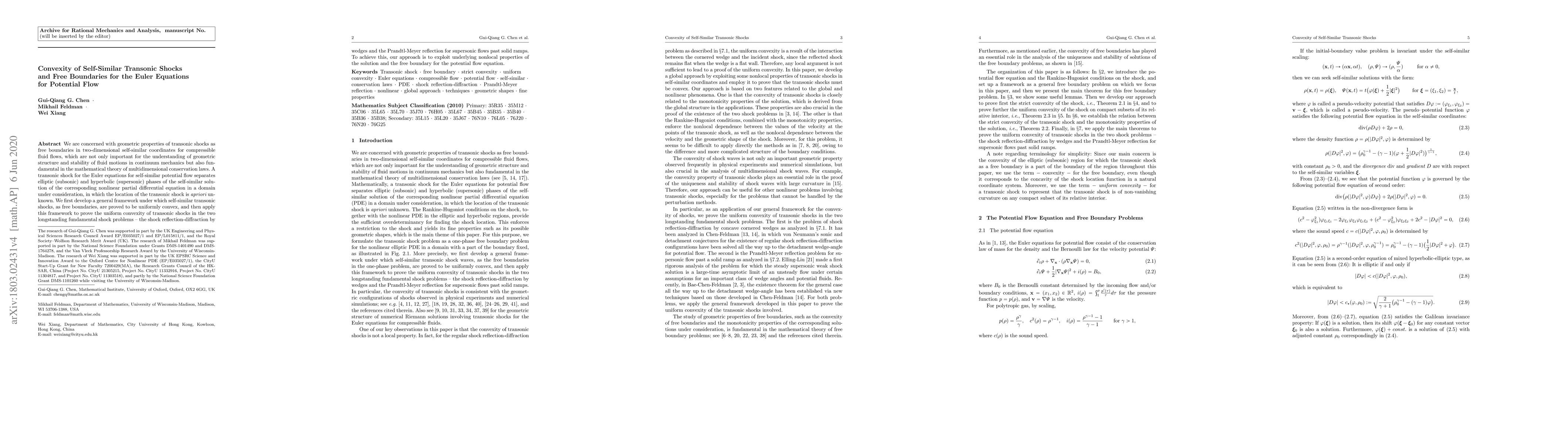 This paper develops a framework to prove the uniform convexity of self-similar transonic shocks acting as free boundaries in two-dimensional compressible fluid flows. It applies this framework to longstanding shock problems, demonstrating the geometric properties' significance in continuum mechanics and multidimensional conservation laws.