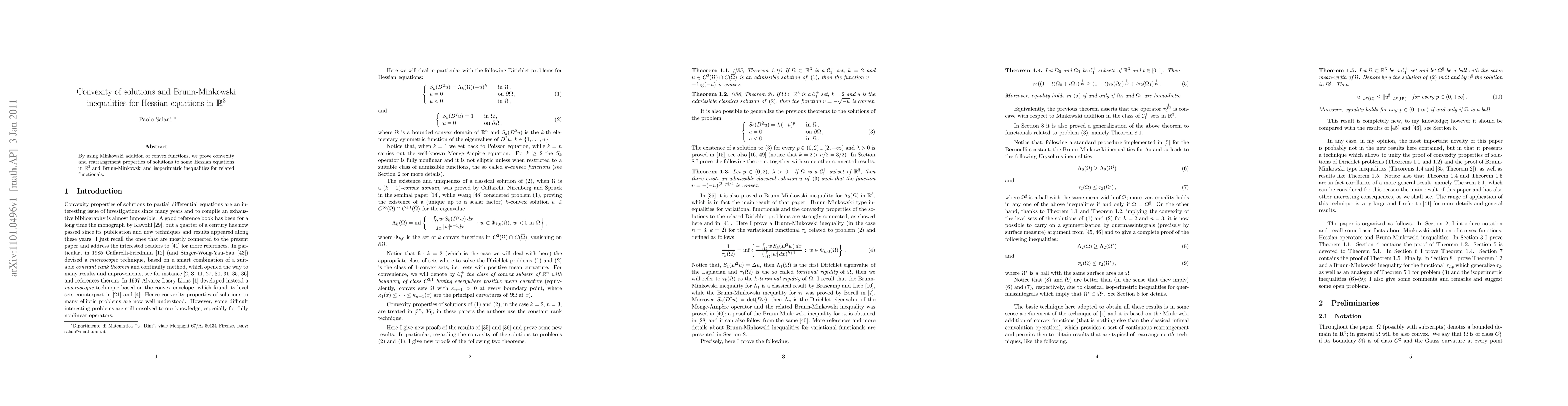 Researchers proved convexity of solutions to Hessian equations in R^3 using Minkowski addition of convex functions, with implications for Brunn-Minkowski and isoperimetric inequalities.
