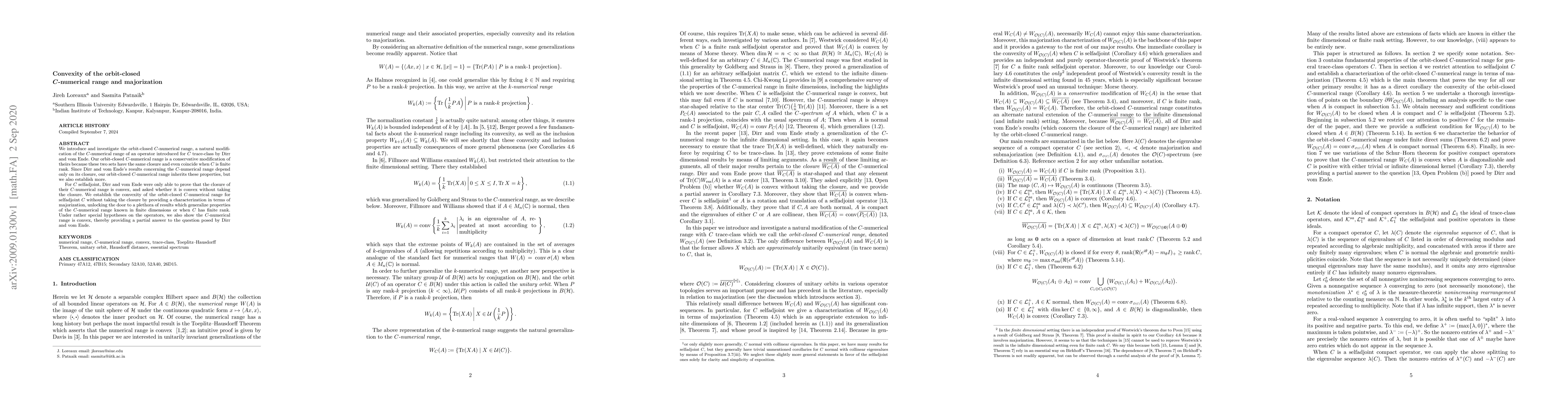 We introduce and investigate the orbit-closed $C$-numerical range, a natural modification of the $C$-numerical range of an operator introduced for $C$ trace-class by Dirr and vom Ende. Our orbit-closed $C$-numerical range is a conservative modification of theirs because these two sets have the same closure and even coincide when $C$ is finite rank. Since Dirr and vom Ende's results concerning the $C$-numerical range depend only on its closure, our orbit-closed $C$-numerical range inherits these properties, but we also establish more. For $C$ selfadjoint, Dirr and vom Ende were only able to prove that the closure of their $C$-numerical range is convex, and asked whether it is convex without taking the closure. We establish the convexity of the orbit-closed $C$-numerical range for selfadjoint $C$ without taking the closure by providing a characterization in terms of majorization, unlocking the door to a plethora of results which generalize properties of the $C$-numerical range known in finite dimensions or when $C$ has finite rank. Under rather special hypotheses on the operators, we also show the $C$-numerical range is convex, thereby providing a partial answer to the question posed by Dirr and vom Ende.