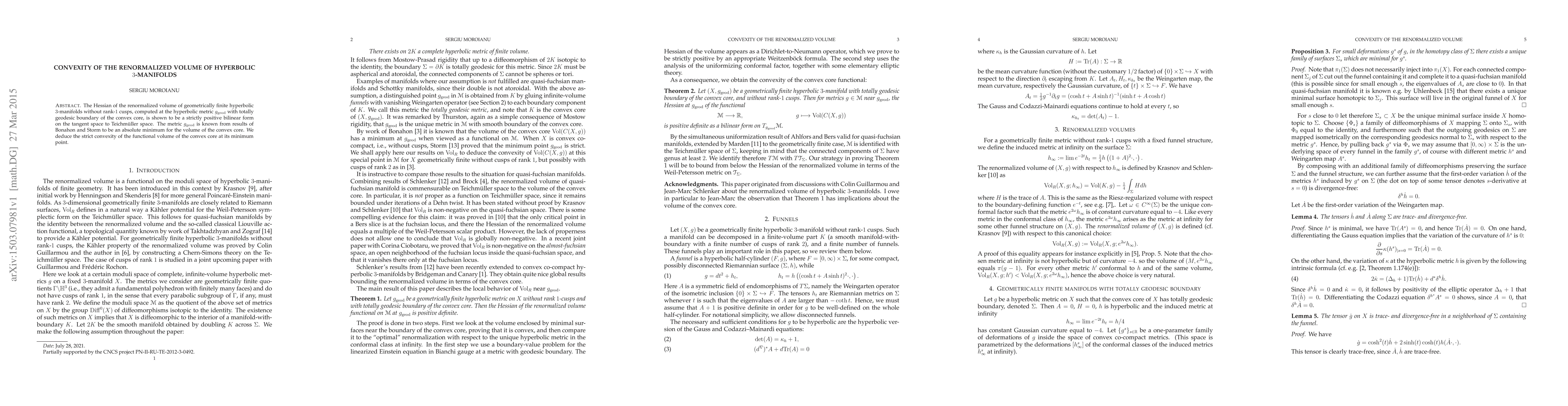 This paper demonstrates that the Hessian of the renormalized volume for geometrically finite hyperbolic 3-manifolds without rank-1 cusps is strictly positive, proving the convexity of the volume functional at the minimum point determined by the totally geodesic boundary of the convex core.